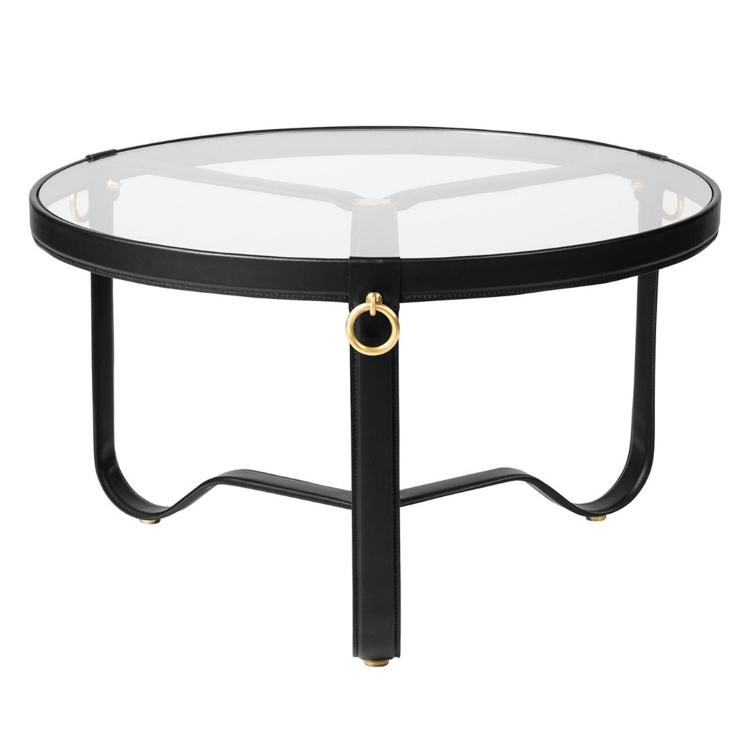 The Adnet table is placed on three soft curved metal legs, elegantly meeting in the heart of the table, the round glass top is edged with a hand-made leather rim and adorned with three gilded brass rings. The timeless design of the Adnet Coffee Table embodies modern materials and superb craftsmanship and adds a distinctive value to any home or professional space.