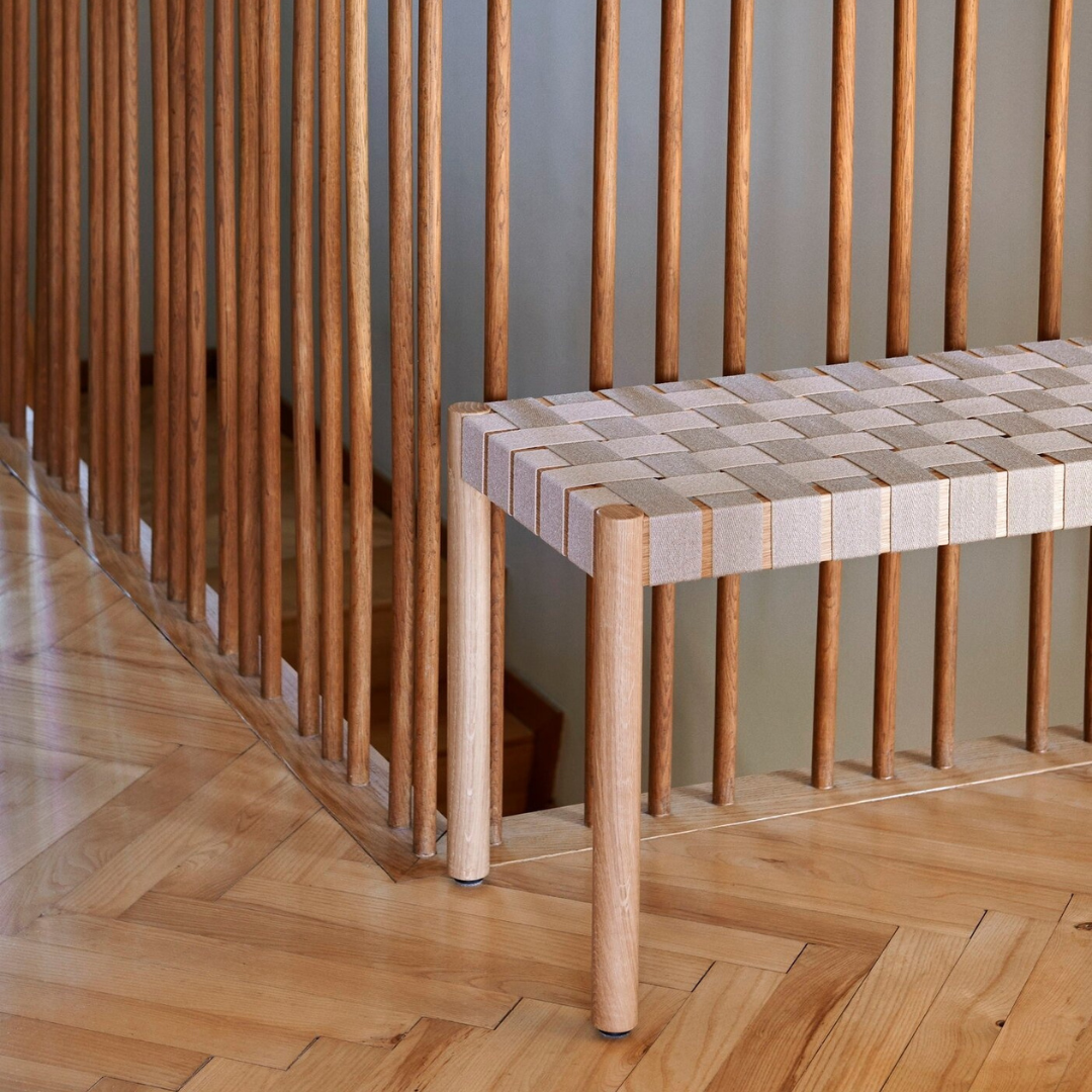 The Betty TK4 bench, designed by Jakob Thau and Sami Kallio for &Tradition, combines a solid oak frame with a linen webbing seat. This blend of natural materials creates a light, organic look and seating comfort that is both flexible and supportive.
