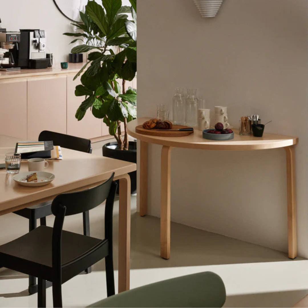 The Artek tables are based on different combinations of the L-legs and table tops by Alvar Aalto. Aalto first introduced the curved L-leg in 1933 and it became a standard part of his furniture designs.