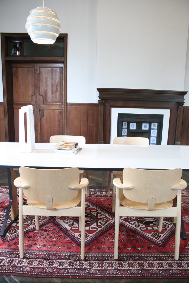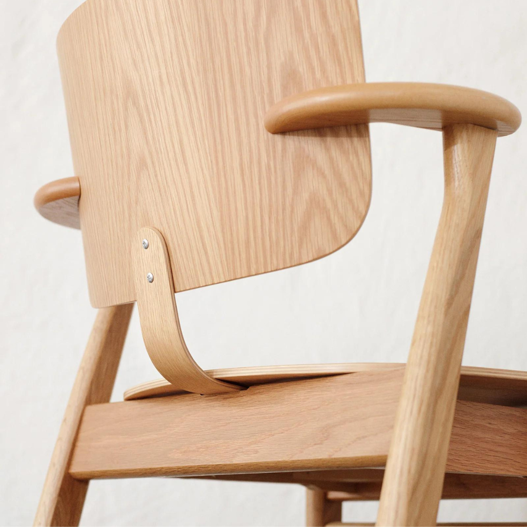 Intended to support hours of studying, the chair’s ergonomic curved seats conform to the body in a comfortable way that supports good posture. Also known as The Finn Chair, the chair’s short arms allow it to be placed close to a table making it perfect for use as a dining table or desk chair.