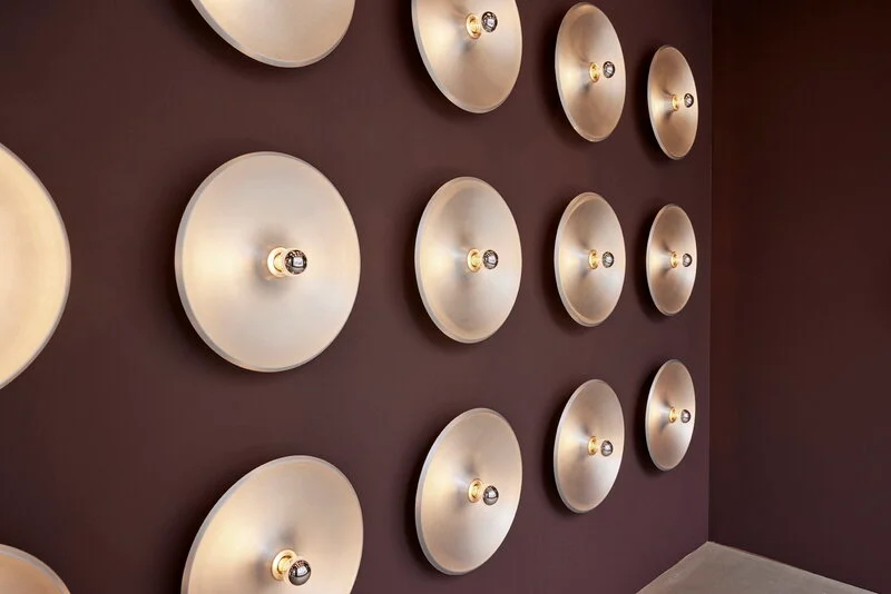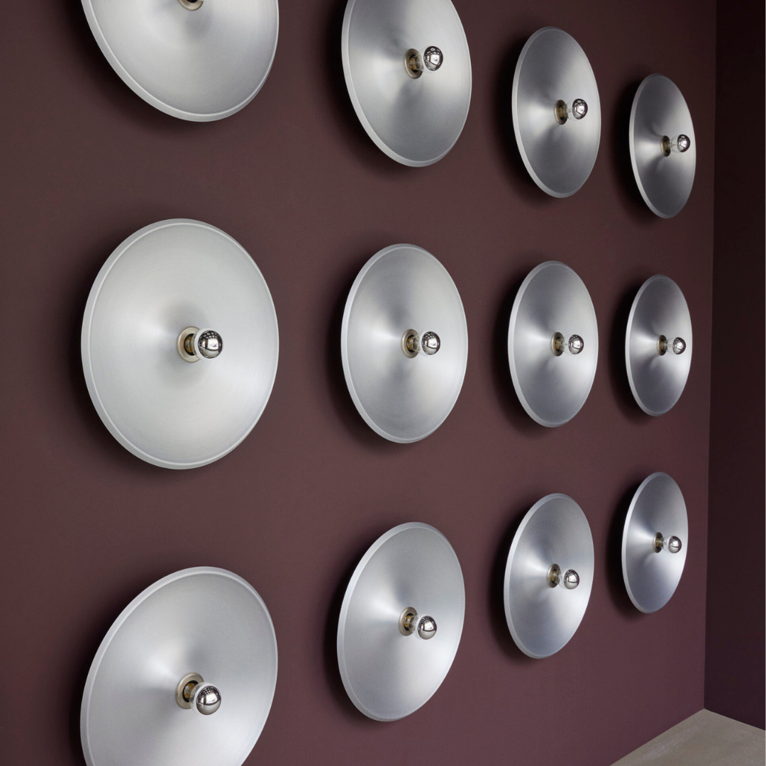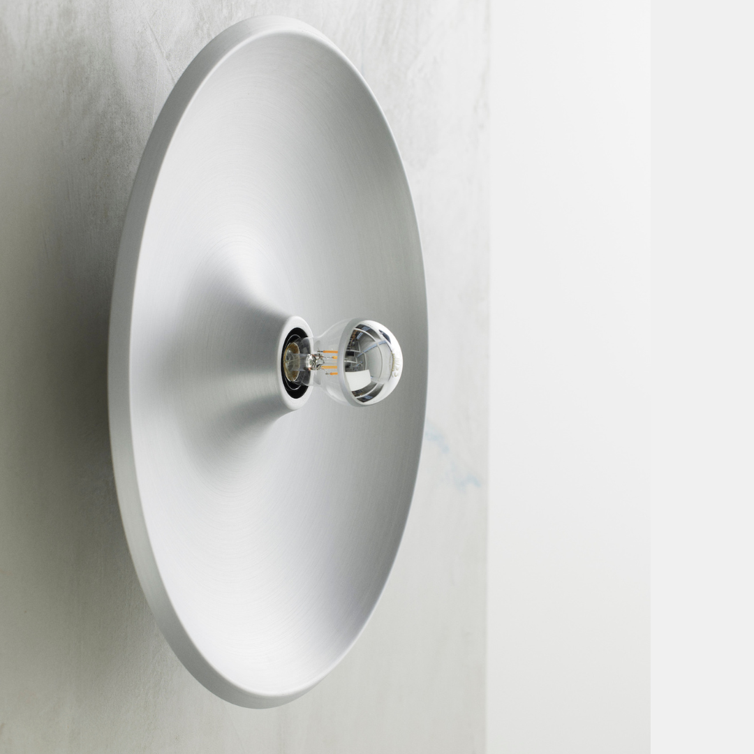 This vision inspired the minimalist shape of the lamp, with a round aluminum reflector that frames the centrally placed bulb and beautifully reflects the shades, resulting in atmospheric ambient light.