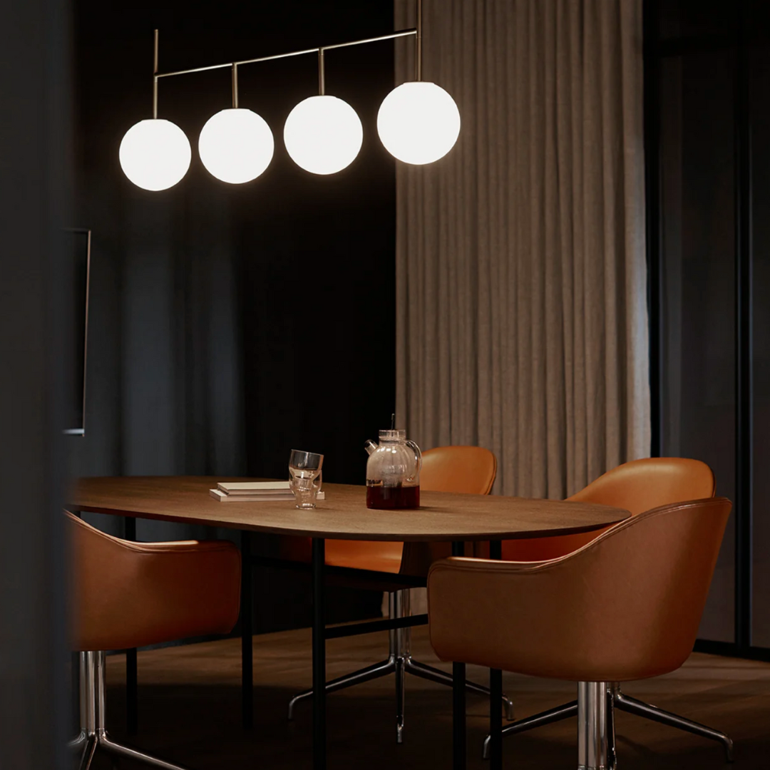 The Audo Copenhagens TR Bulb pendant features a black or polished steel suspension frame with four matt opal glass Bulbs. The pendant makes an elegant eye-catcher in the living room, lobby or any large space.