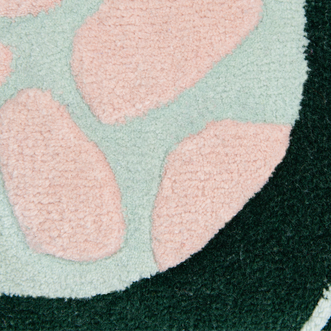 With a soothing colour palette of deep forest green, soft mint and warm blush tones, the cushion creates a harmonious yet powerful visual contrast. Abstract, stony shapes alternate with structured grid patterns, creating a sense of movement, balance and depth. The result is an artistic accent that fits perfectly into both modern and eclectic interiors.