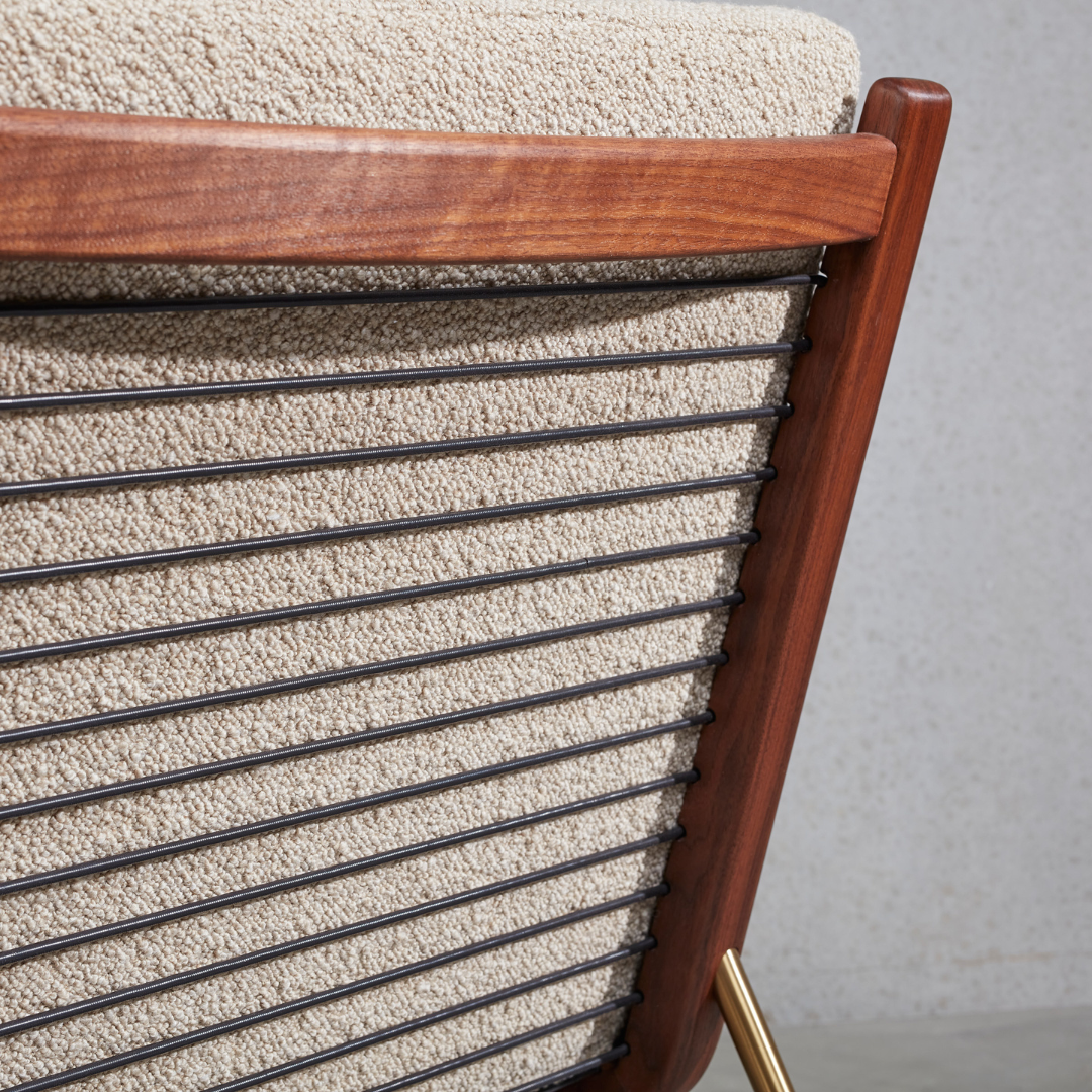 The design features softly contoured cushions nestled within a hand-polished solid walnut frame supported by slender brass legs. This subtle combination of wood, textile, and metal gives the chair a luxurious yet understated look. A playful detail is the curved wooden crossbar at the front, which adds a touch of character to the otherwise sleek design.