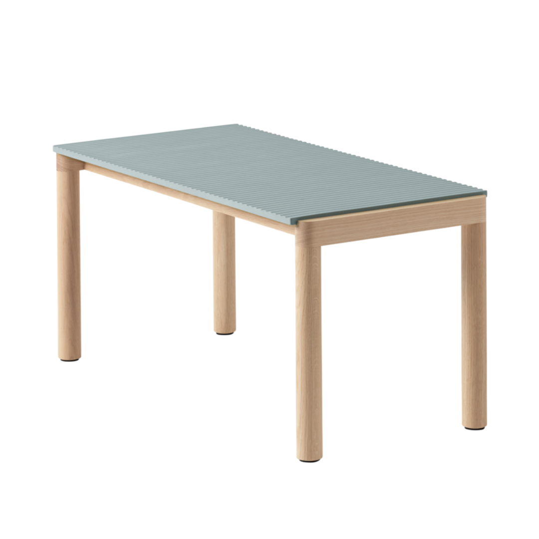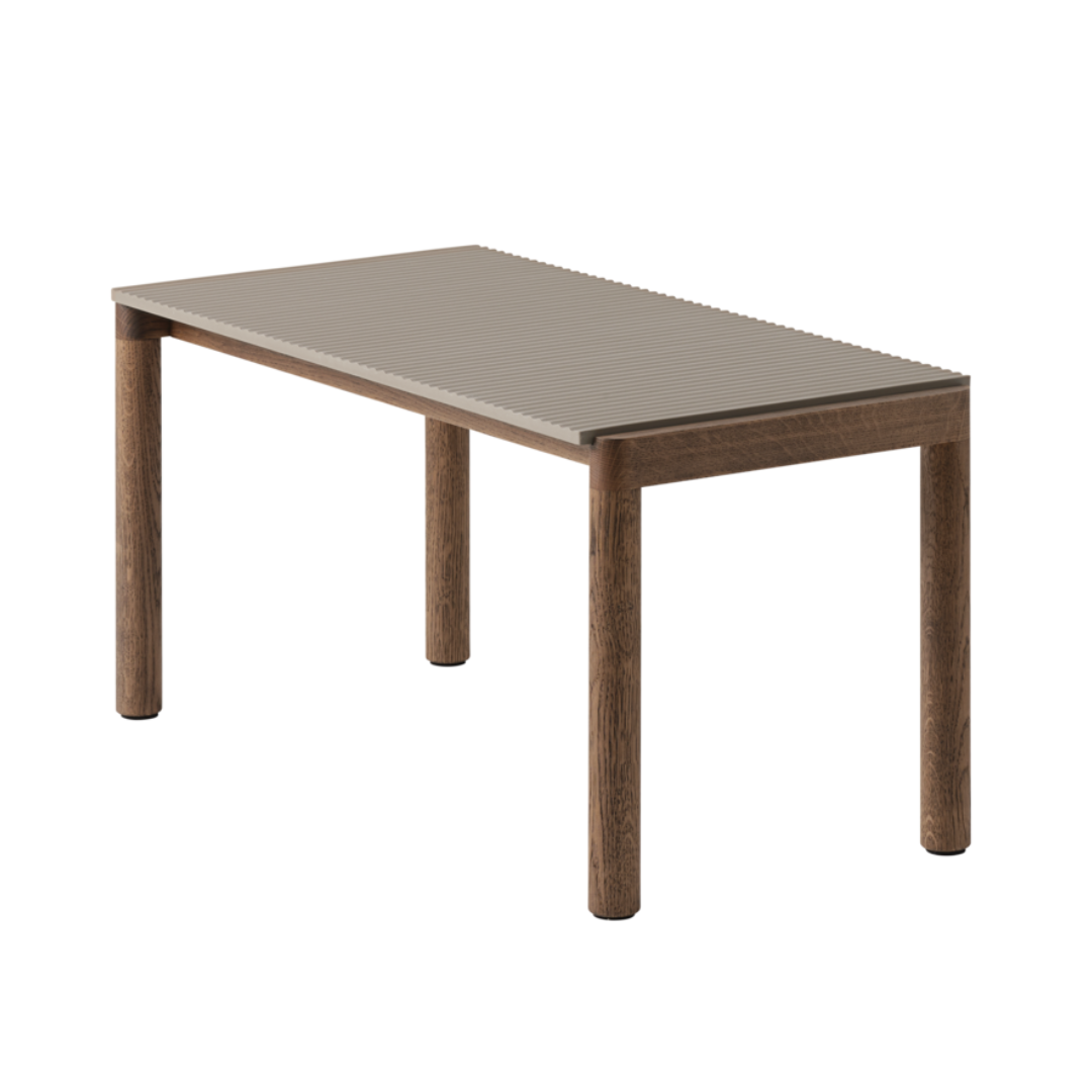 This feeling of a stone table is enhanced by the option of two different tabletop tiles; one with a simple and functional surface, the other with a more pronounced wavy feel.