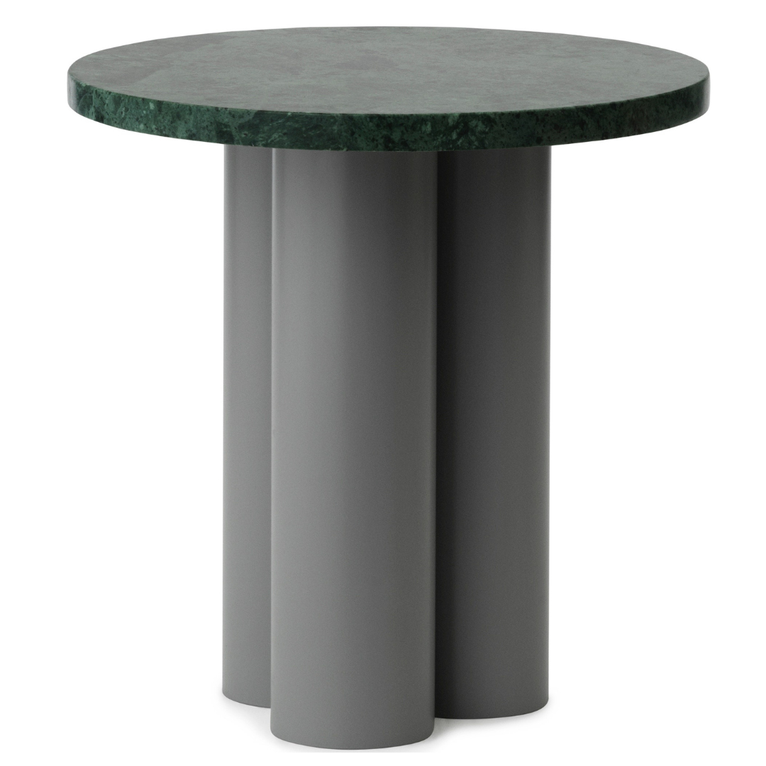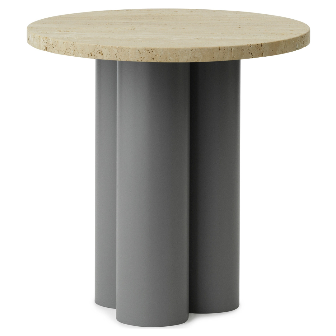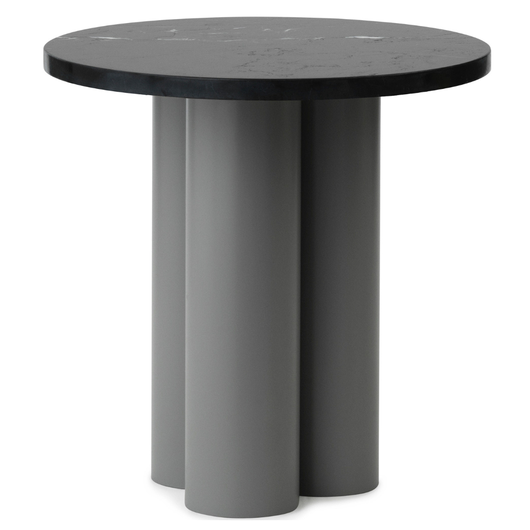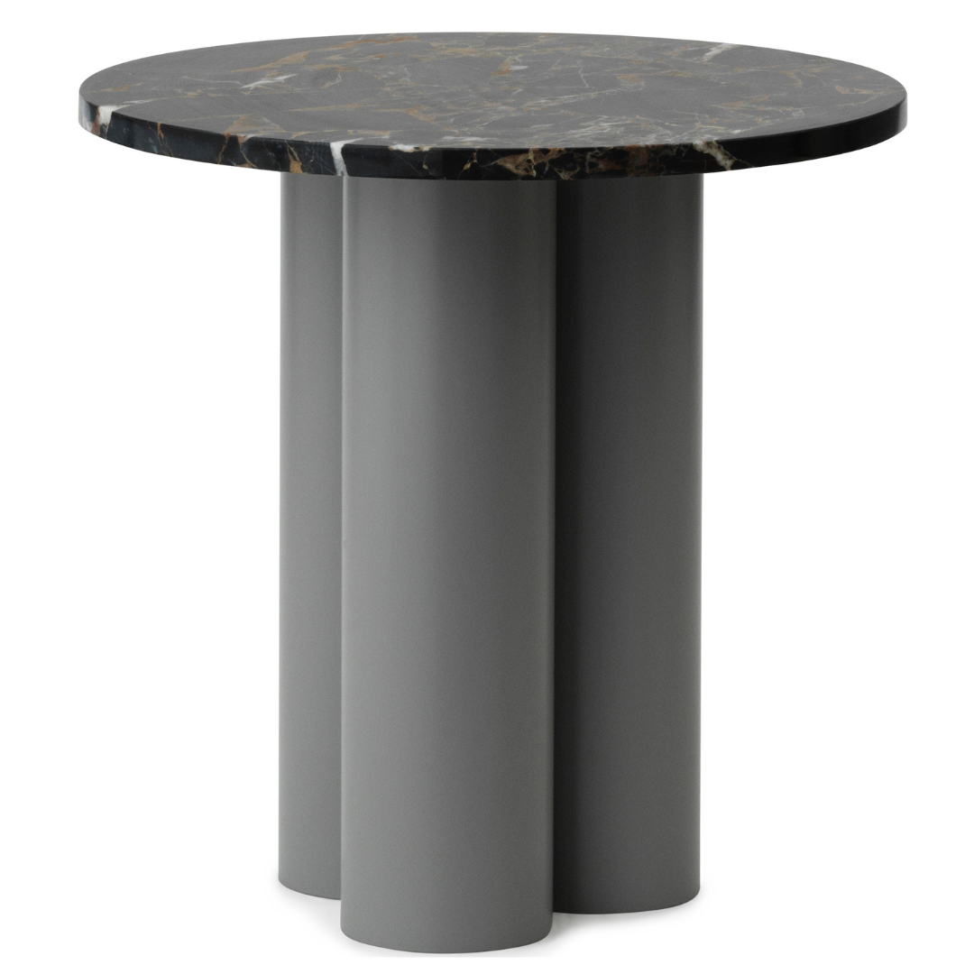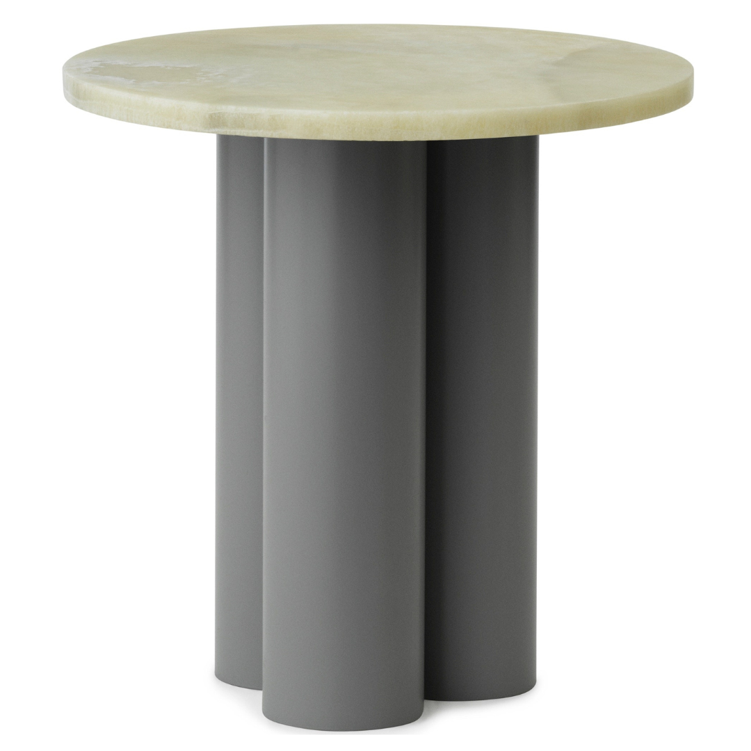 Each This table has a stone top with a natural beauty, and is supported by three oversized cylindrical legs of powder-coated steel. The tables can serve as a side table, base for a flower arrangement, or table lamp, and as a bedside table.