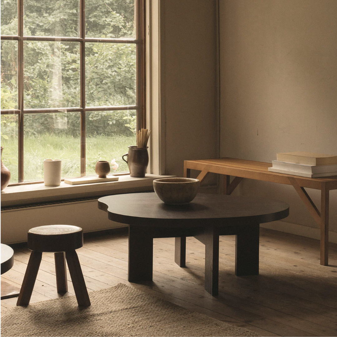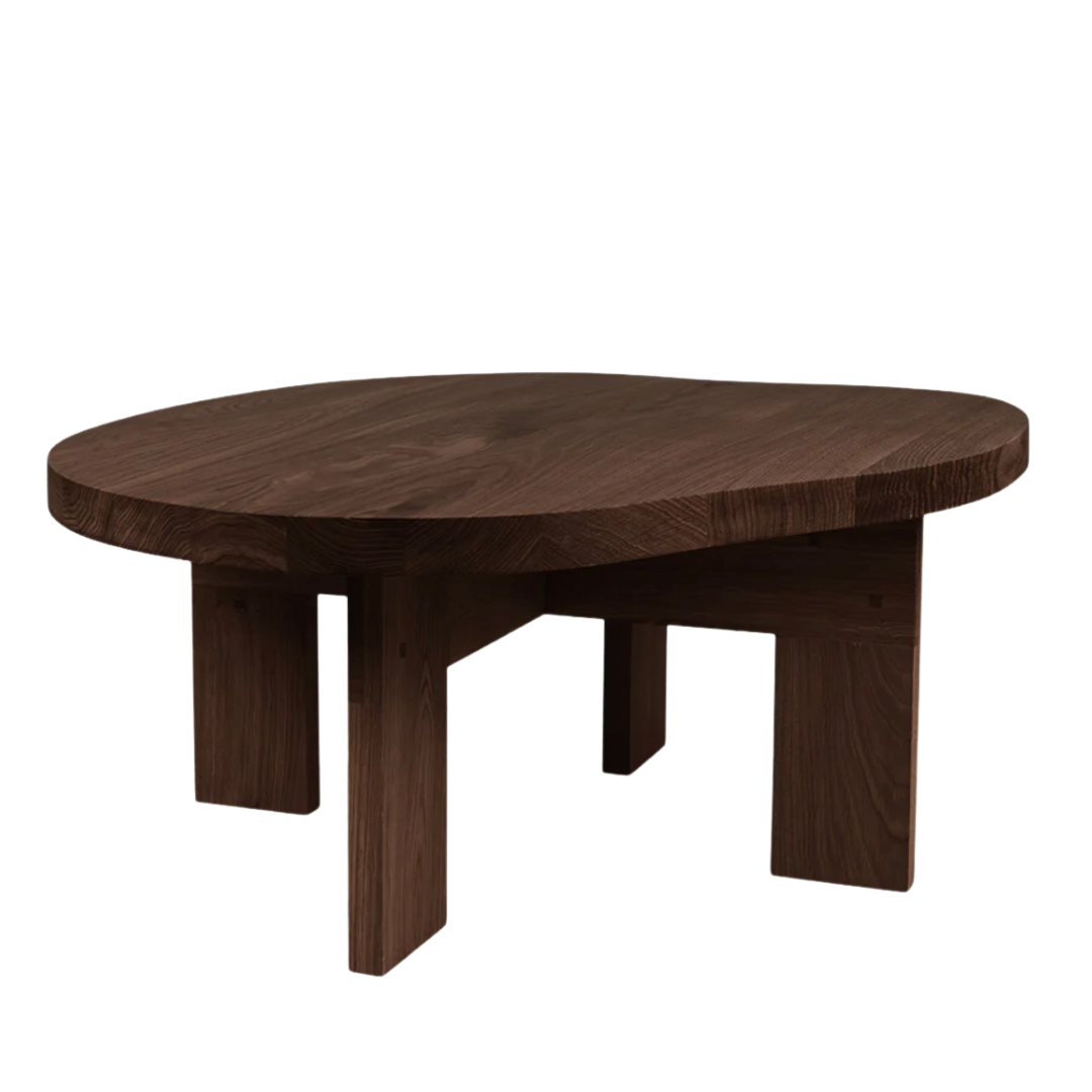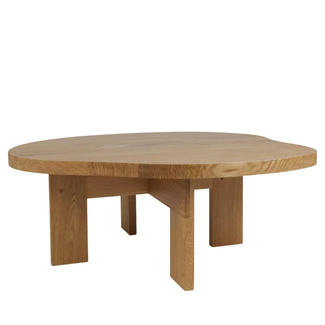 The beautiful Farmhouse coffee table round from the Danish brand Frama, has a sculptural table top with an organic shape of flowing lines. This solid oak table is composed of two trestles that resemble the exposed beams often seen in traditional farmhouses. On top rests a solid oak table top.