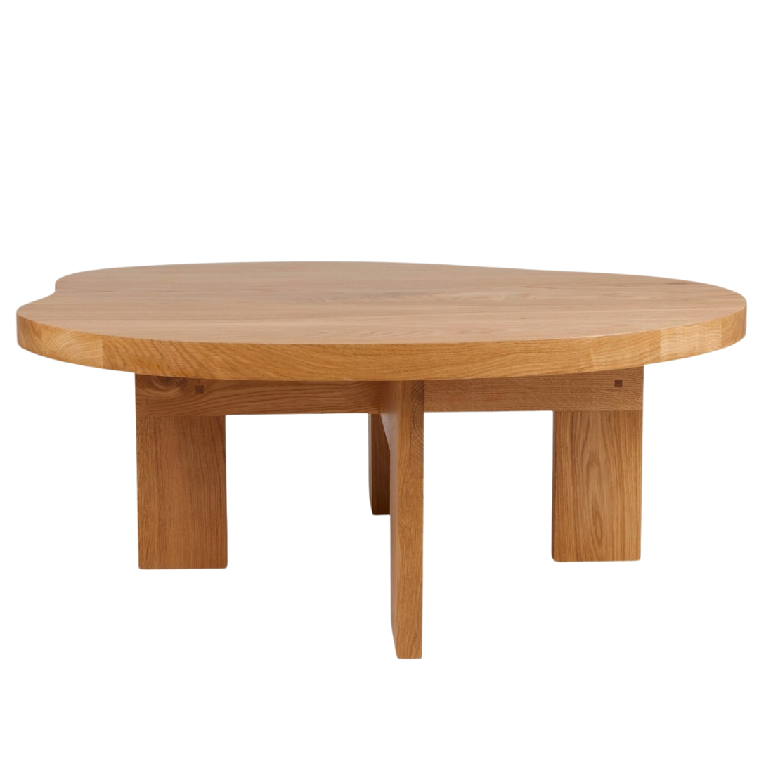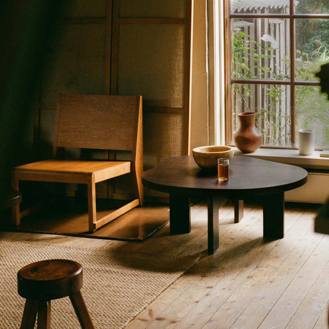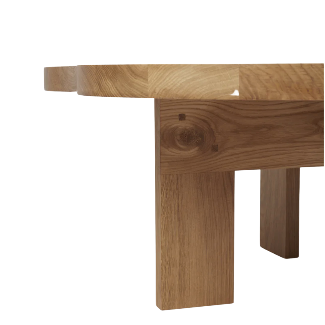 The beautiful Farmhouse coffee table round from the Danish brand Frama, has a sculptural table top with an organic shape of flowing lines. This solid oak table is composed of two trestles that resemble the exposed beams often seen in traditional farmhouses. On top rests a solid oak table top.
