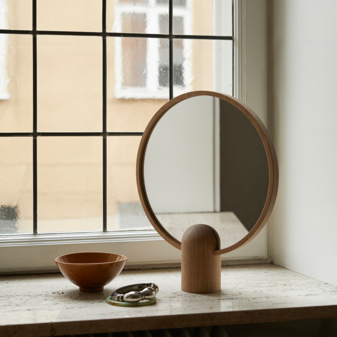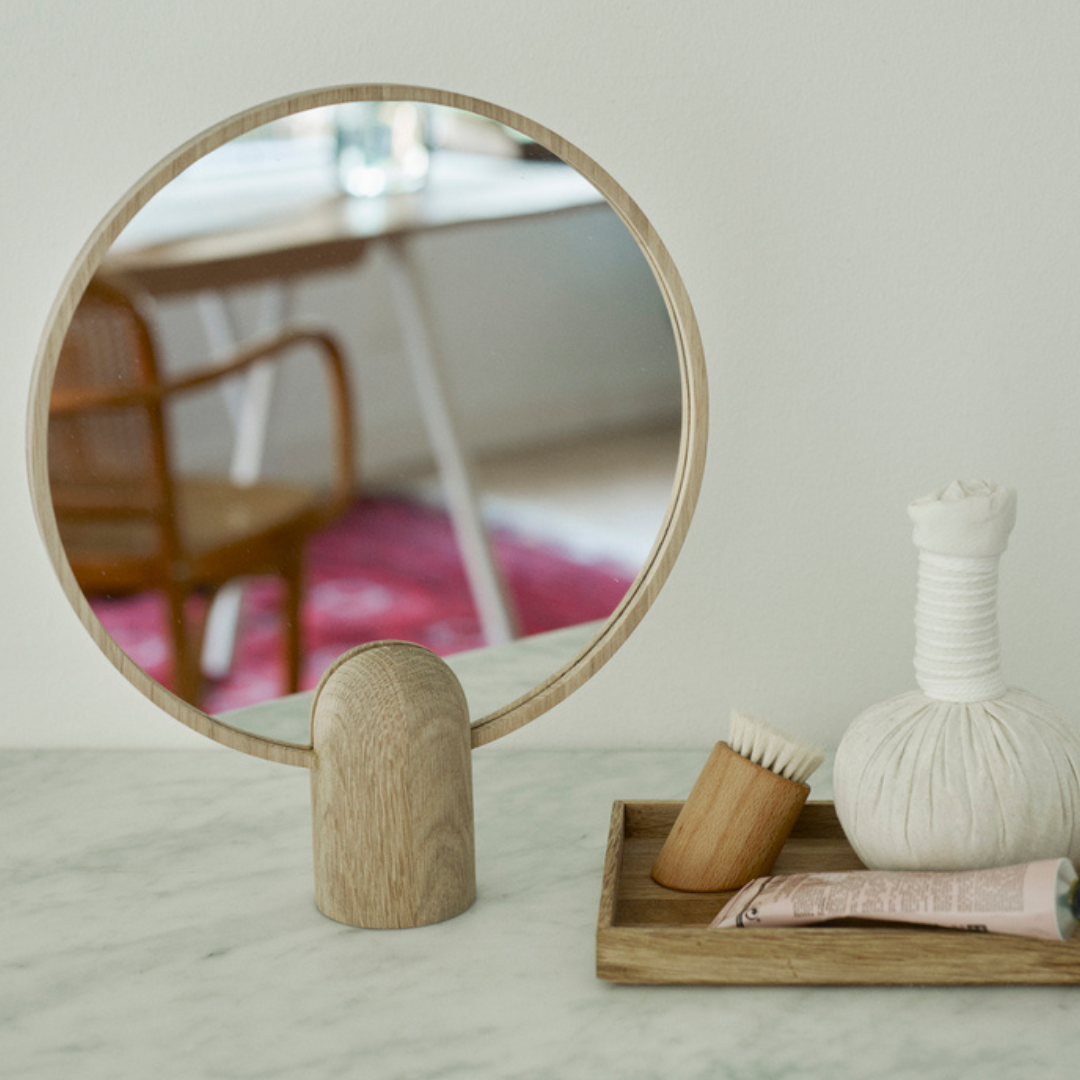 The Aino series of double-sided mirrors reflects sculptural simplicity at its best. Functional design as beautiful to look at as it is to look in to. Designed by the Finnish-based design duo Studio Kaksikko A modern take on the traditional looking glass, the Aino Mirror marries function and form in one elegant design. Its FSC-certified oak frame is shaped to stand on a dresser or shelf as well as to sit comfortably in the hand.