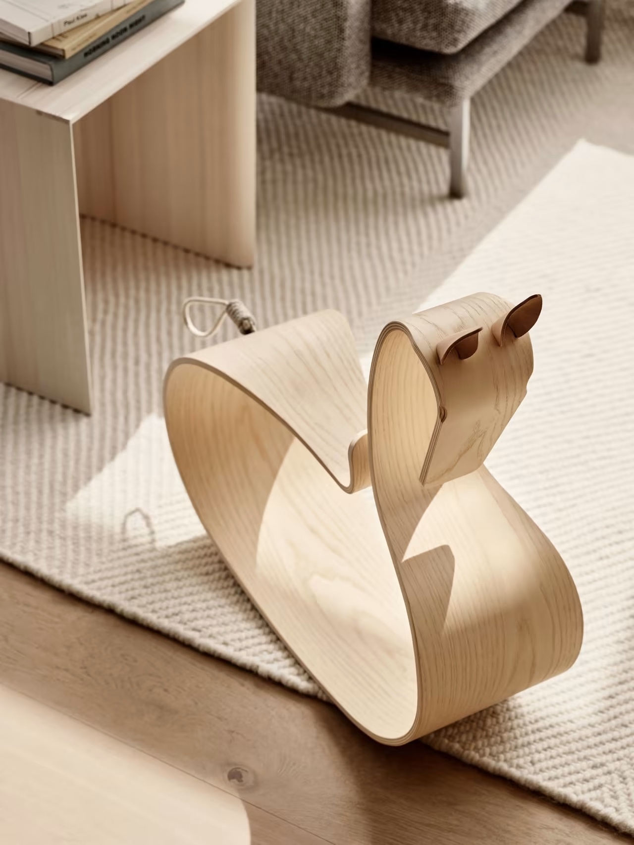 This reissue is based on images and drawings of the prototype dating from 1946, when the first attempts were made to bend the veneer to its limits. The horse is made from one piece of veneer, the same material that was used shortly afterwards for Arne Jacobsen's famous chairs.