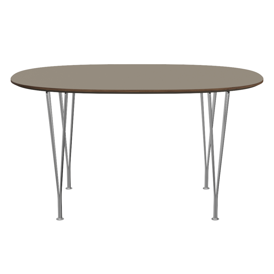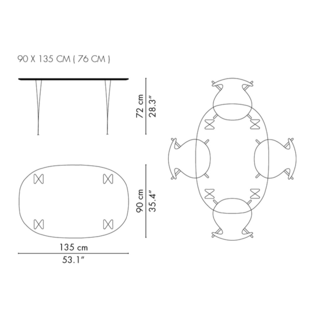 The B611 Super-Elliptic Table 135 cm is one of the smaller and compact tables in the Super Elliptical range and is ideal for use as a kitchen table of work desk in your home, the table is H72 cm high and the table top measures 135 x 100 cm. making it perfect for four persons. The table has so-called "hairpin legs" made of chromed steel and an oval-shaped tabletop made of plastic-coated wood veneer and beautiful bevelled edges.