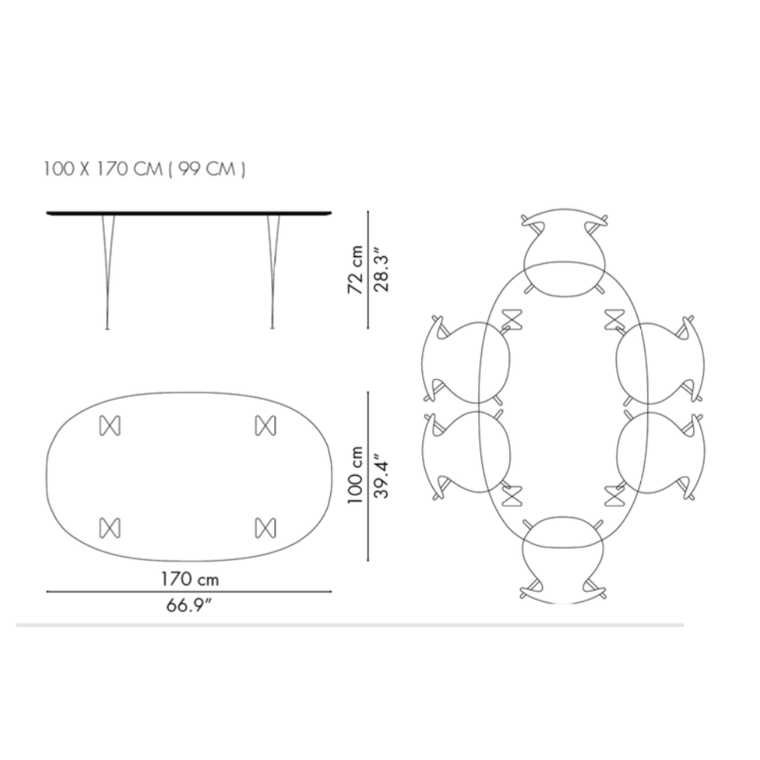 The B616 Superellipse Table 170 cm is a spacious table for use as a dining table or work table in your home, the table is H72 cm high and the table top measures 170 x 100 cm., making it perfect for six persons. The table has so-called "hairpin legs" made of chromed steel and an oval-shaped tabletop made of plastic-coated wood veneer and beautiful bevelled edges.