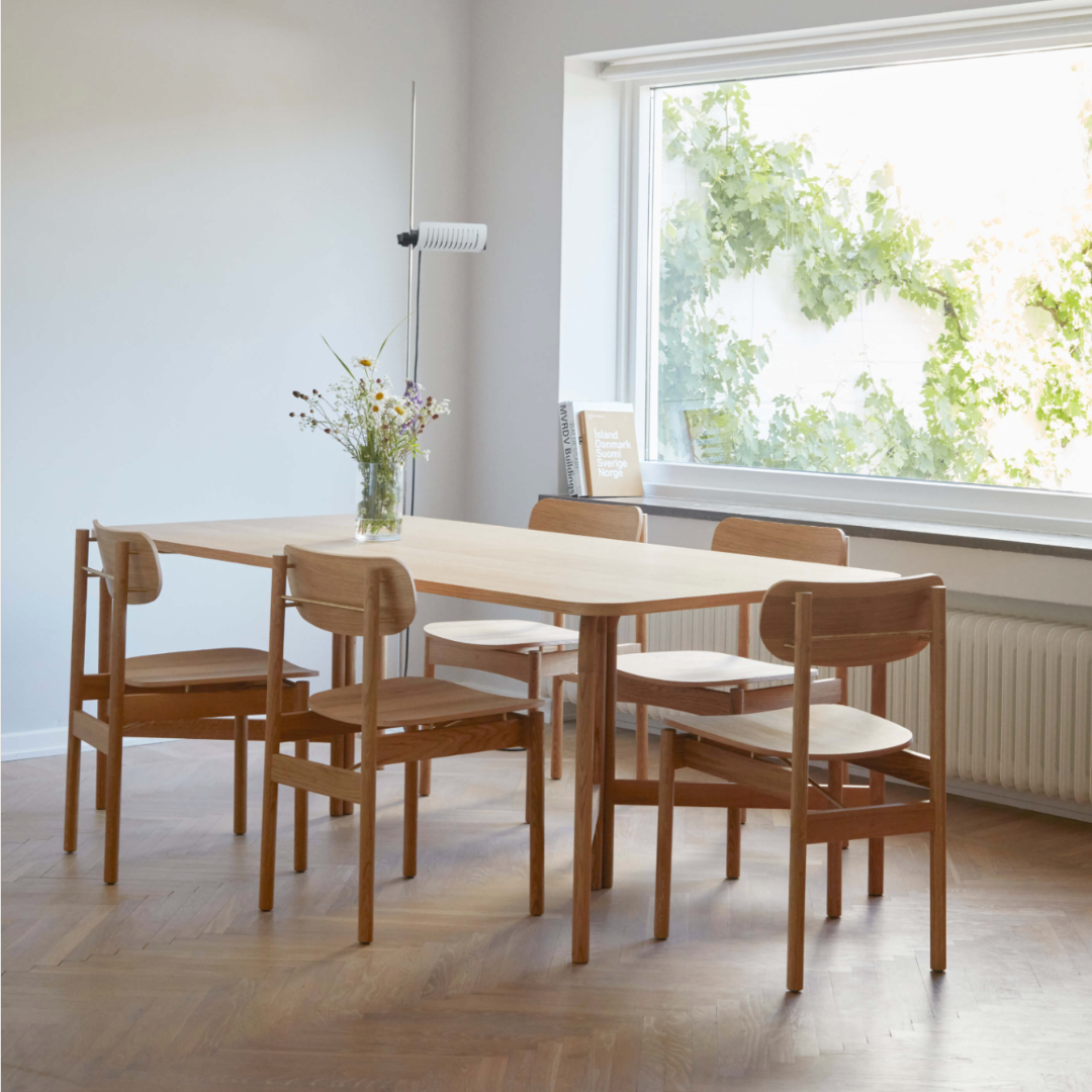 A dining chair designed in a well-proportioned idiom, the Vester Chair combines beauty and elegance with function and comfort. A transverse brass rod at the back indicates where to pull out the chair. Legs continuing up into the backrest form a small hook for hanging a purse or small item. The chair’s body in golden oiled 100% FSC-certified oak naturally contrasts the fine brass detailing in this award-winning piece.