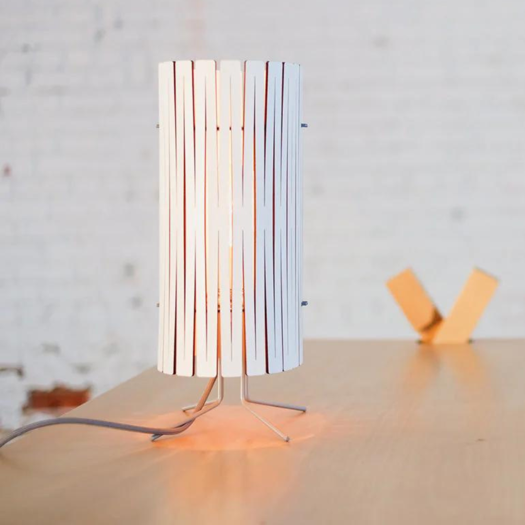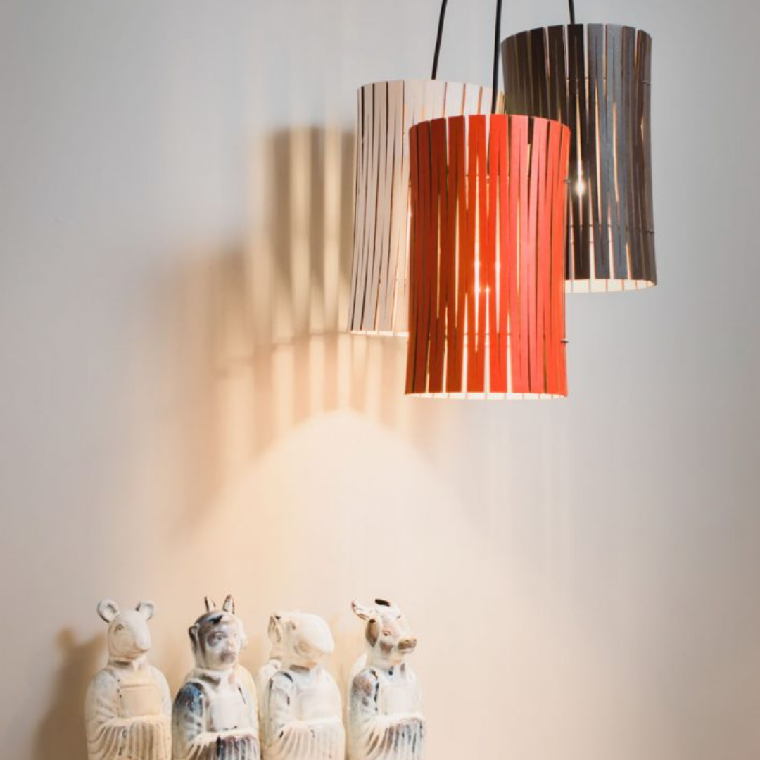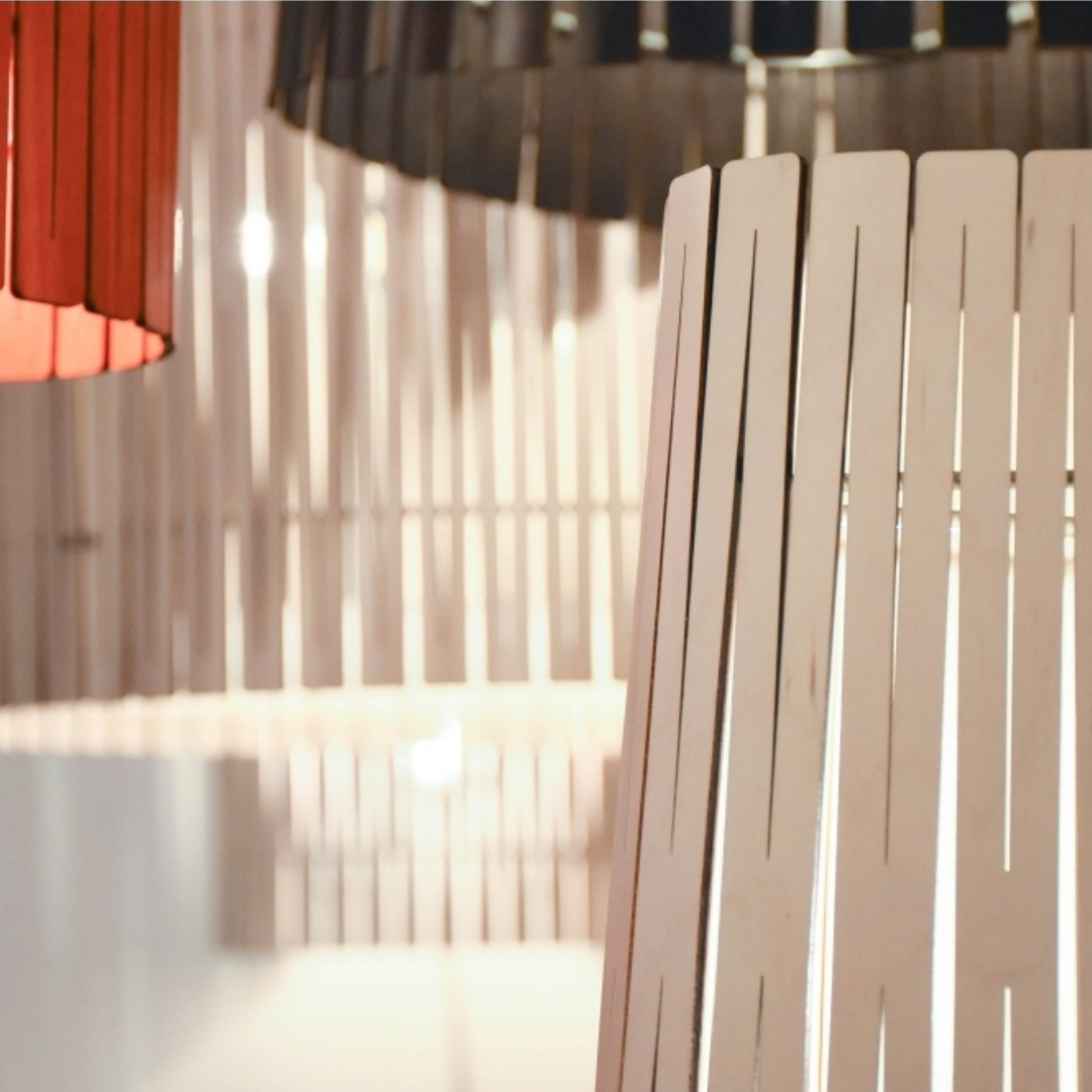 The lampshades are made from high-quality FSC-certified plywood with a unique sawn pattern in the panels that cast intriguing shadow patterns on your walls and table surfaces.