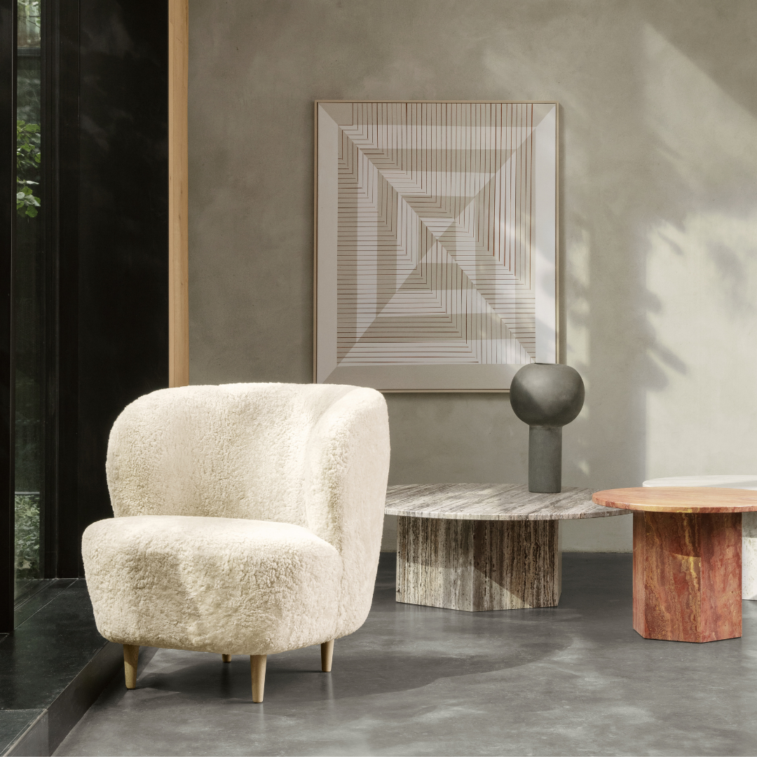The Stay lounge chair by Gubi has a gracefully sculptural design that invites you to stay and relax. Designed by Space Copenhagen, the Stay lounge chair is both reduced and characterful at the same time, and its precise, straight lines are softened by rounded corners. The lounge chair, upholstered with soft, curly sheepskin, is equally well suited for home and public use.