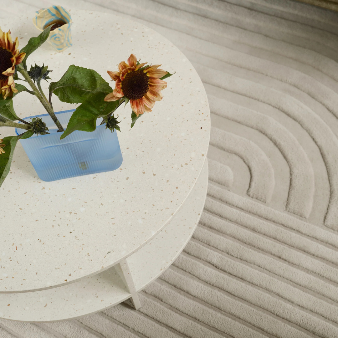 The design is constructed from a single, solid volume of terrazzo composite stone, where form and material reinforce each other. The soft off-white and light taupe color variations create a calm, balanced look that harmonizes with a variety of interior styles—from minimalist and architectural to warm and natural.