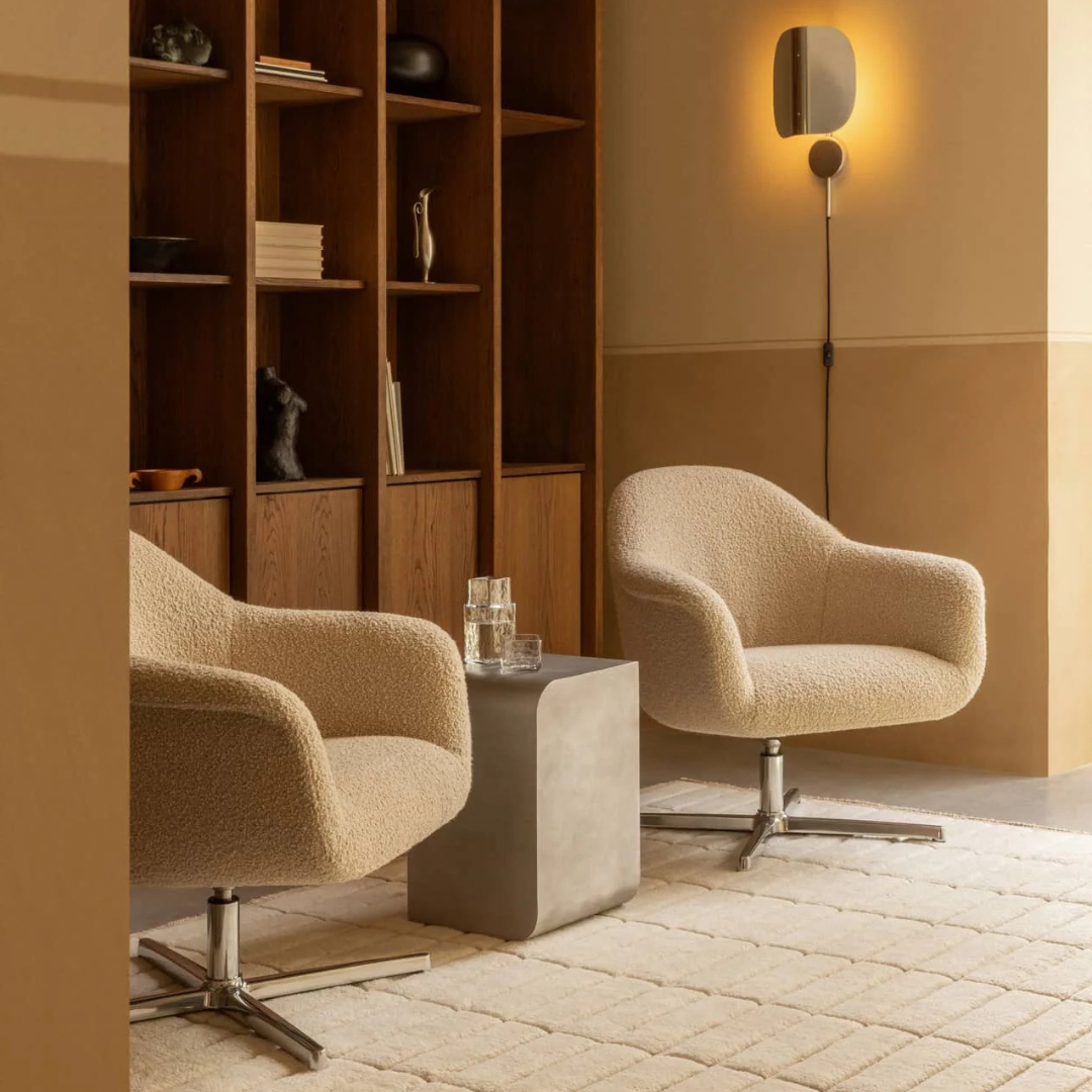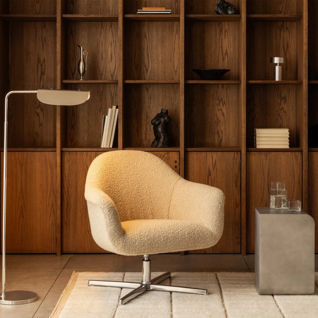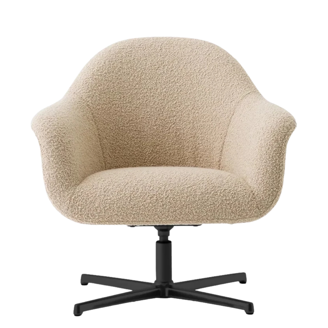 The Harbour Swivel Lounge Chair with Star Base by Audo Copenhagen, designed by Norm Architects, invites you to relax with its soft shapes and thoughtful ergonomics. This lounge chair combines comfort with a refined, minimalist look and fits effortlessly into both living spaces and professional environments.