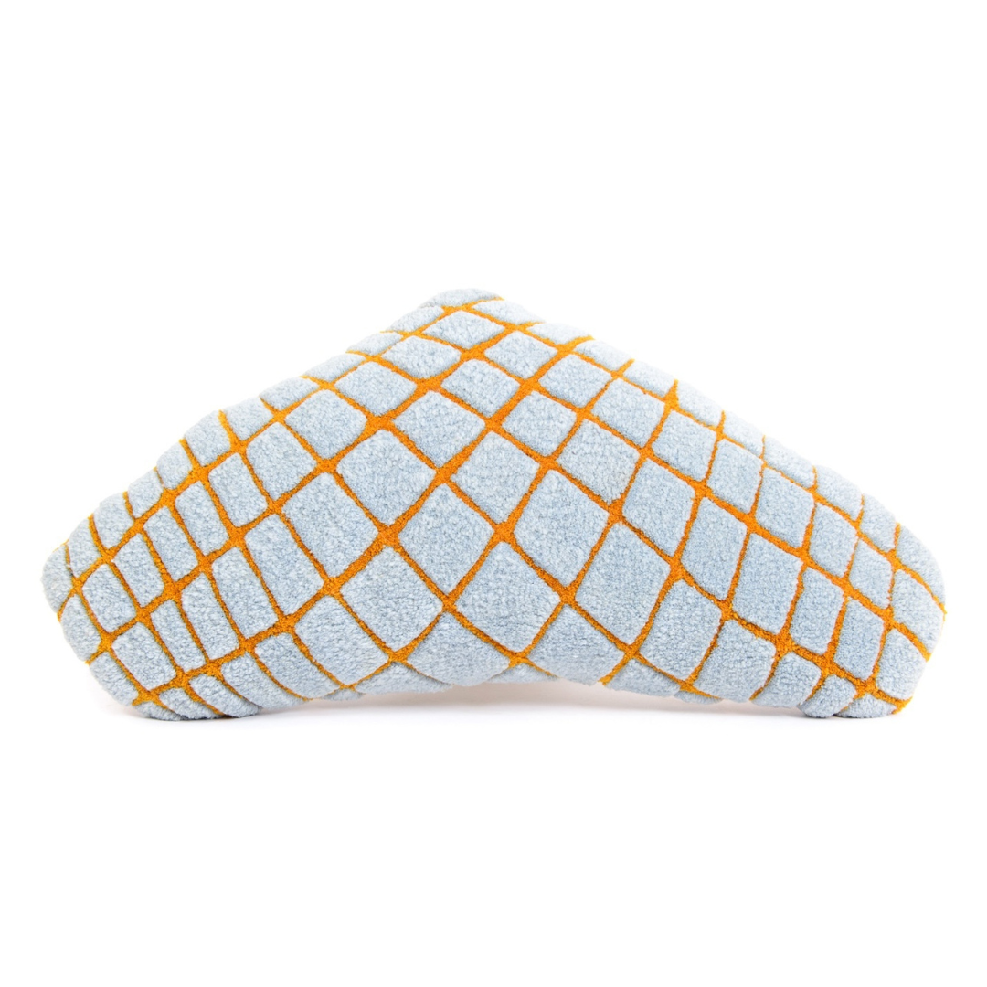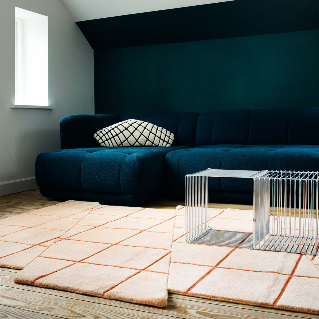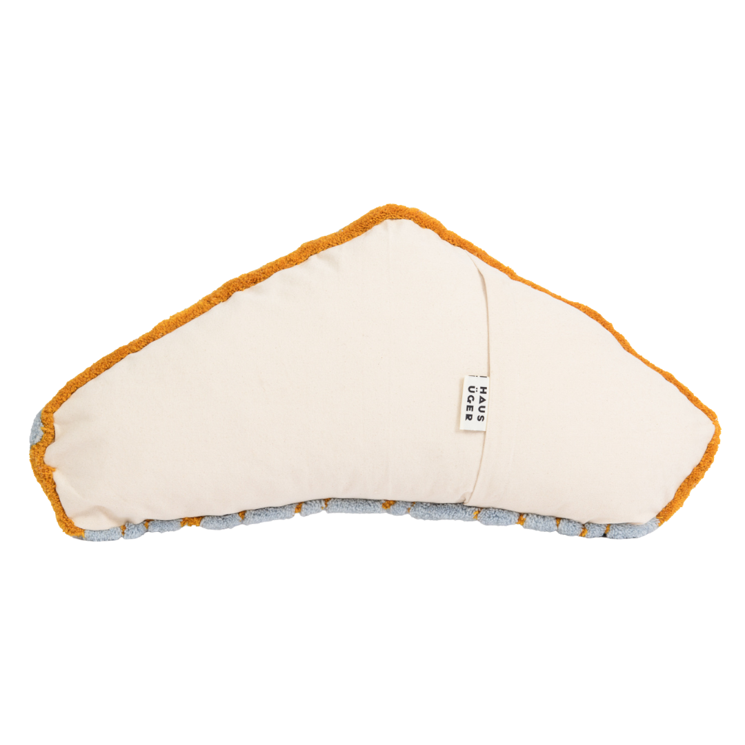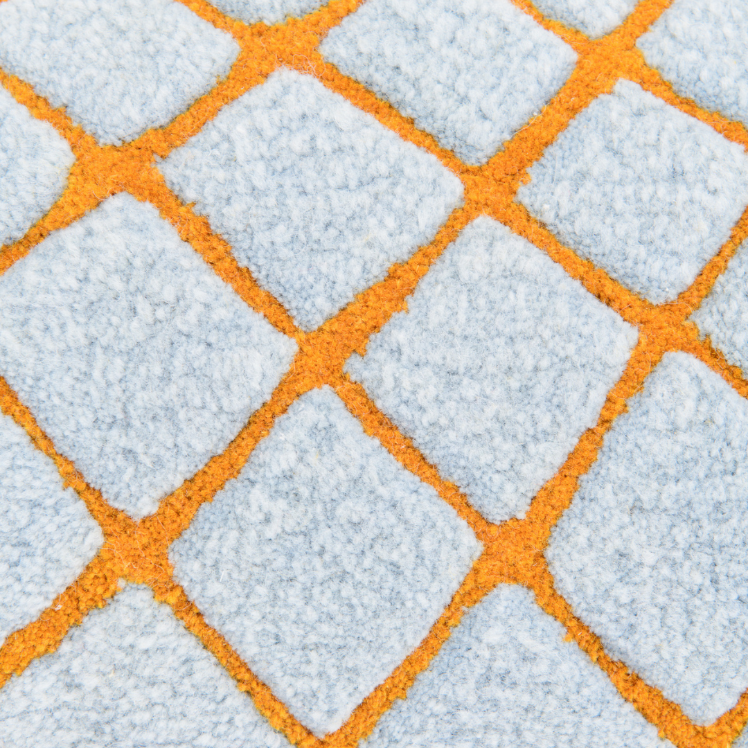 A sleek sky blue pattern runs across a orange base, creating a timeless monochrome look. The hand-tufted texture adds depth and character to the design, while the elongated, cloud-like shape introduces a sense of movement and softness. This balance of structure and comfort makes the Grid Slim cushion versatile in both your modern and eclectic interiors.