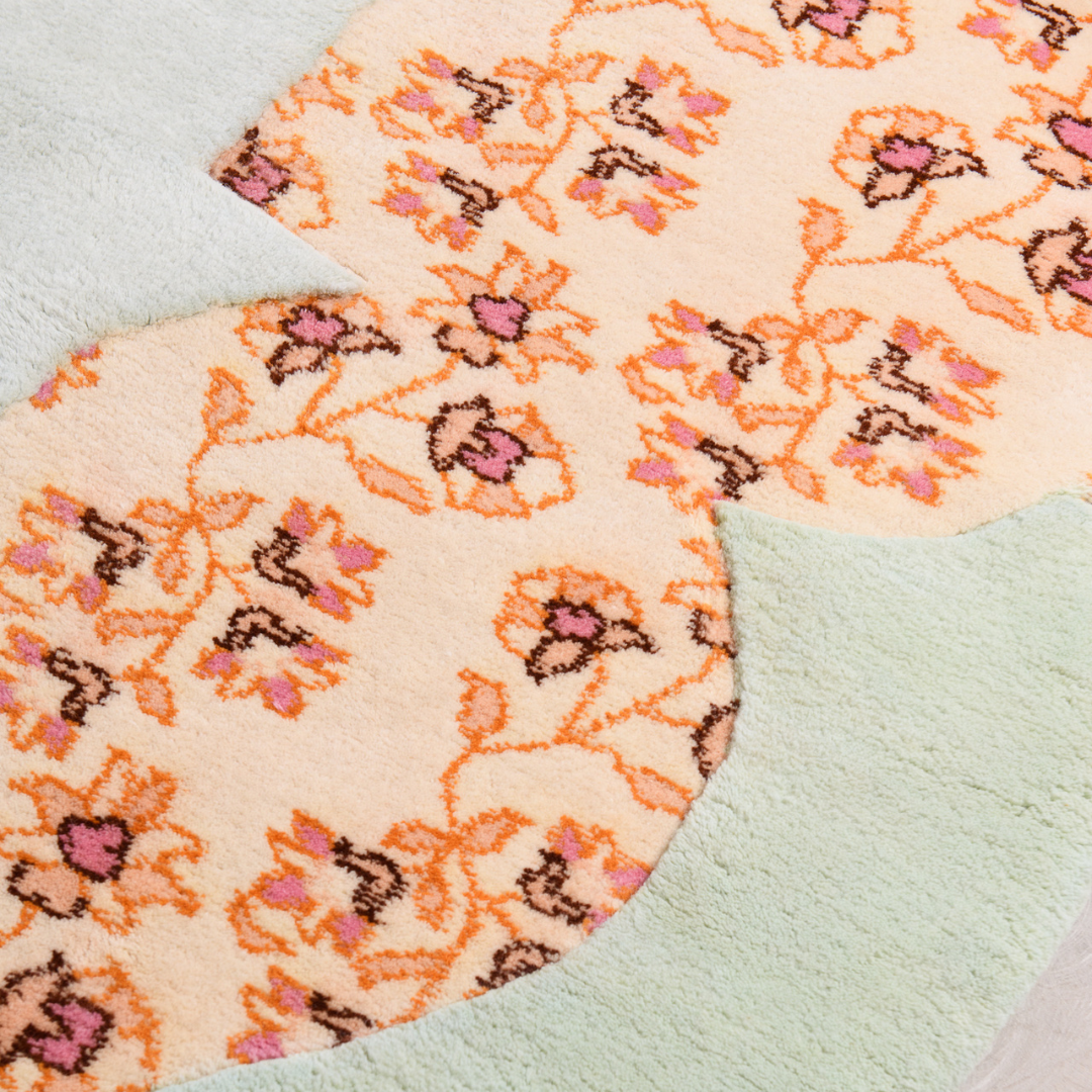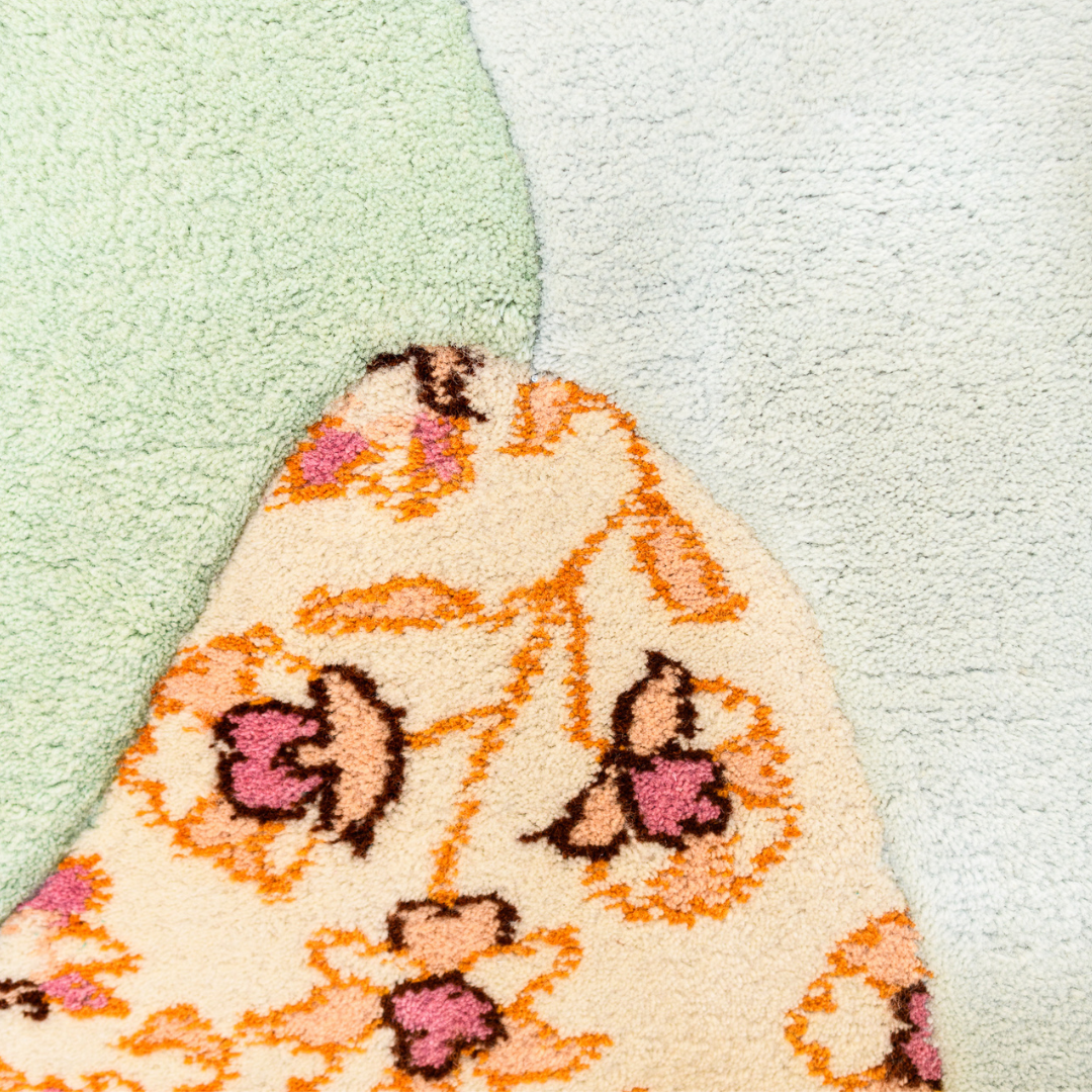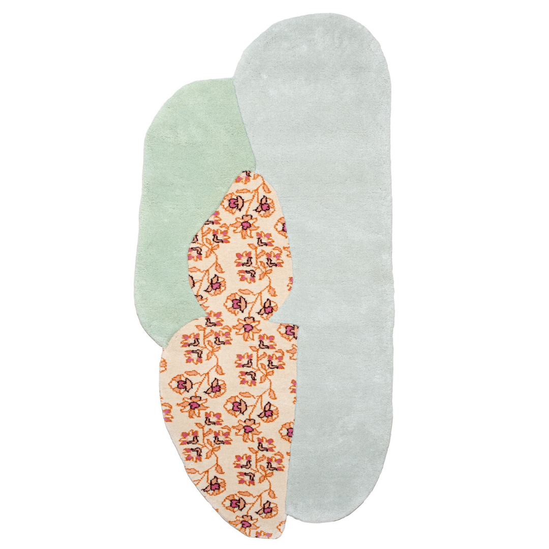 The design combines muted green tones and soft pastels with graceful floral patterns in warm nuances. The asymmetrical, sculptural shape is reminiscent of the flowing lines of leaves and petals, giving the rug a dynamic and natural character.