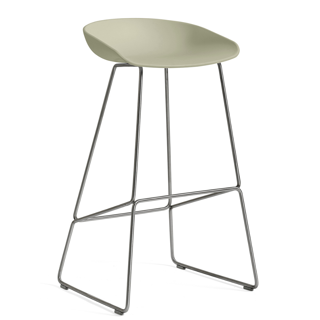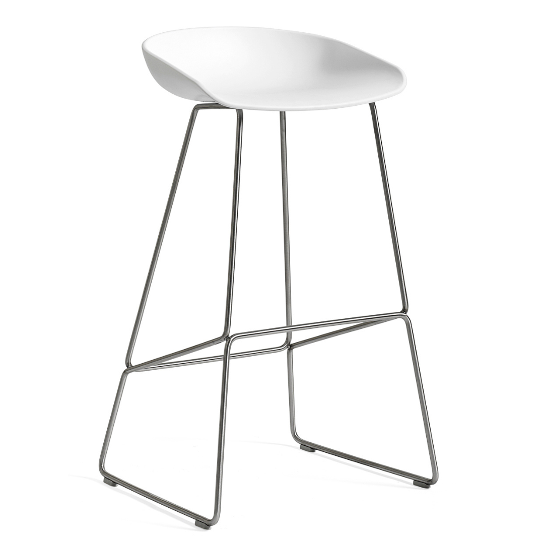 The Hay bar stool About A Stool AAS 38 has the same capacity for transformation as the other members in the series, ranging from a minimalistic plastic stool to a more full-bodied upholstered version. The curved backrest is balanced on an elegant rounded frame in metal, showcasing a more industrial design with a strong visual presence. Suitable for as using as a bar stool in bars and restaurants, as well as at home for informal meals. Available in two heights and in a wide range of metal finishes and colour.
