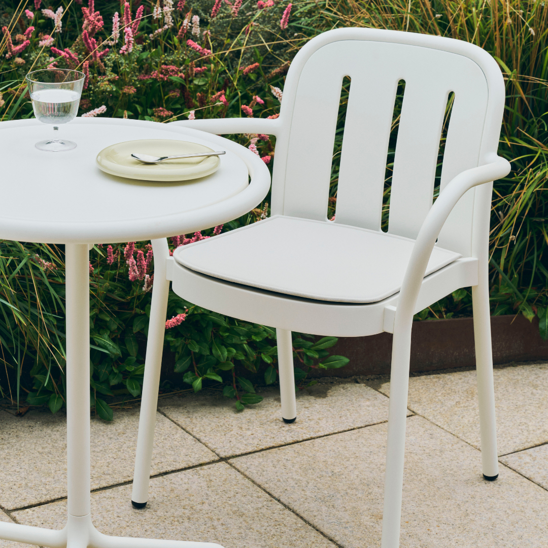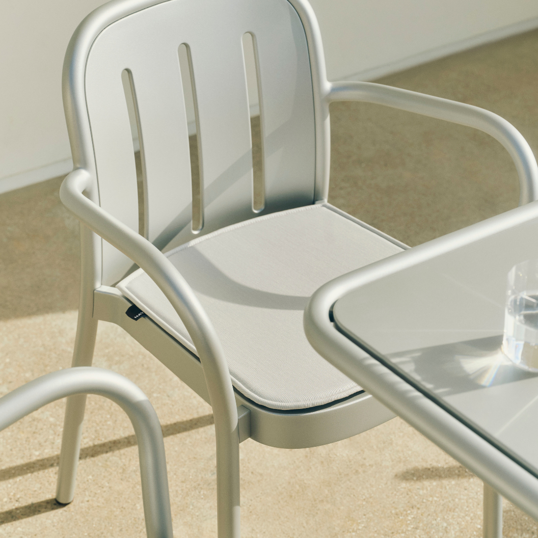 The Deville seat pad is designed as a refined complement to the Deville chair and armchair from HAY Outdoor. With its sleek shape, the seat pad subtly enhances seating comfort without detracting from the light and open character of the design.