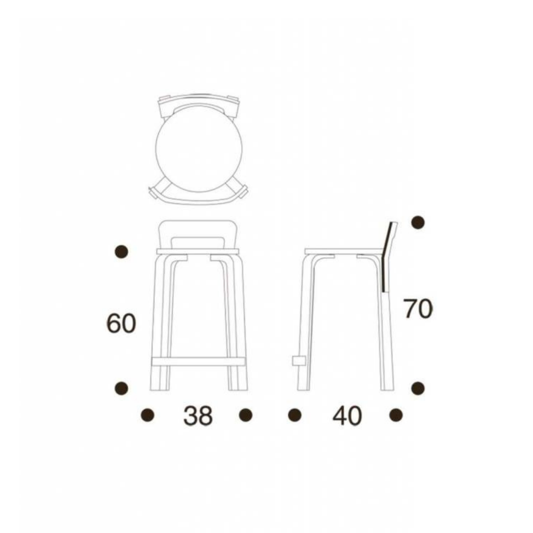 The K65 bar stool from Artek is 65 centimeters high and has a diameter of 52 centimeters. The legs and seat edge are made of solid birch wood. The core of the seat is available in 2 variants: solid birch wood or birch plywood.