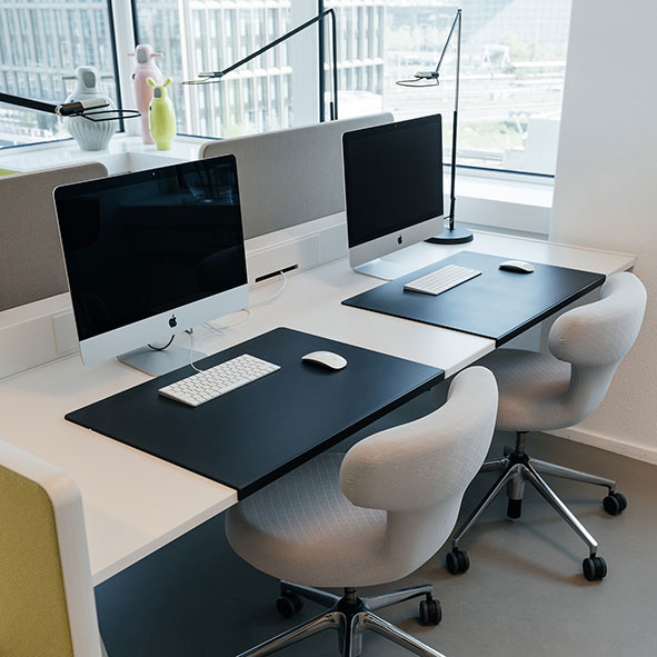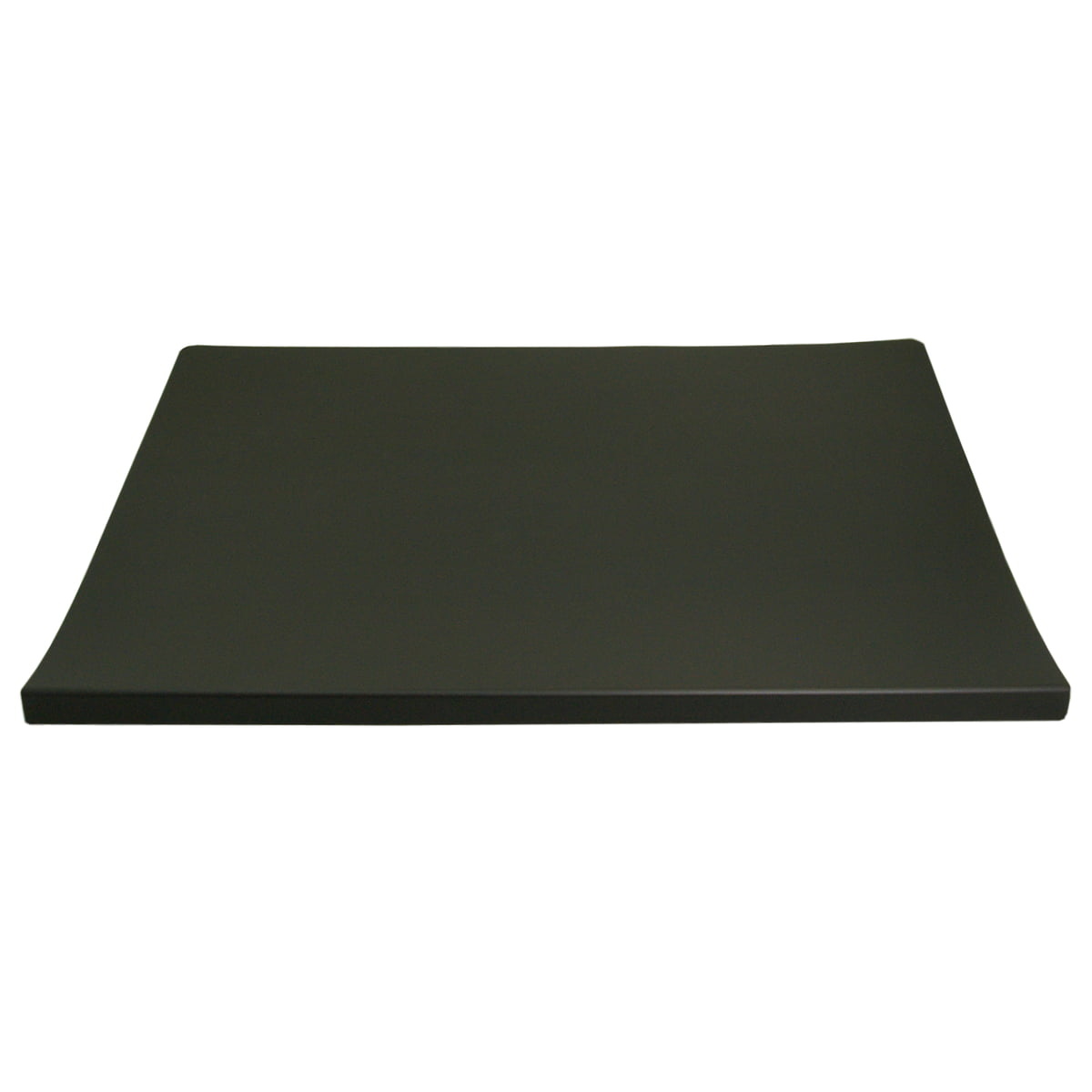The simple desk pad made of black polyurethane is curved on one side, so that it fits perfectly on the edge of the table and does not slip while working. The stable and extremely sturdy surface feels pleasant to the touch and provides a stable surface for your computer, glasses, cup of coffee, calculator, etc.