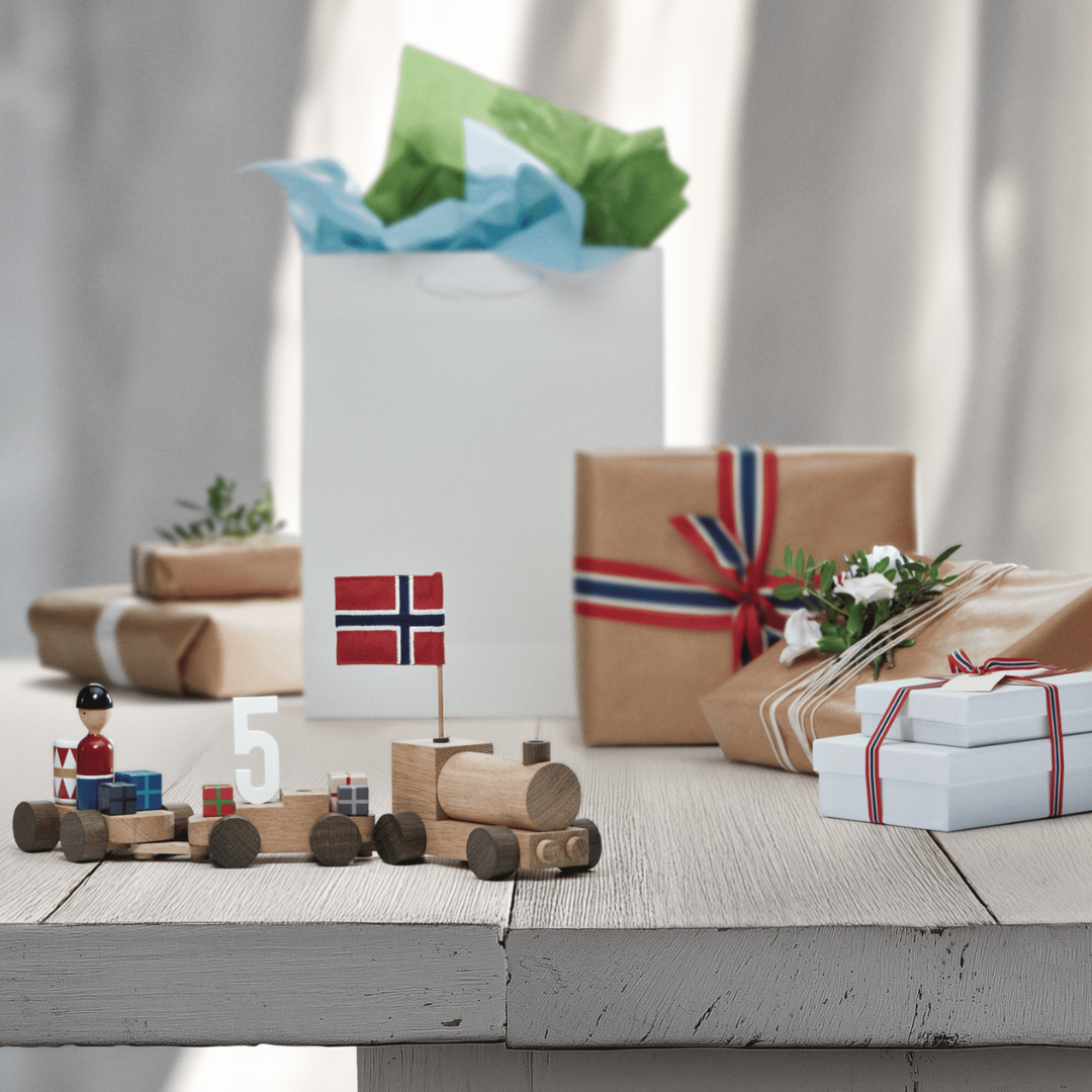 Inspired by an original Bojesen design, the 37 cm long locomotive features a holder for a flag or number. The two included wagons are festively decorated with colorful parcels, a small guard figure, and a drum, made of FSC®-certified and painted beechwood.