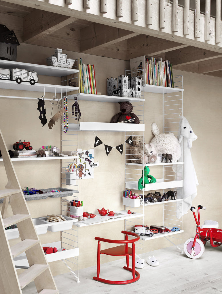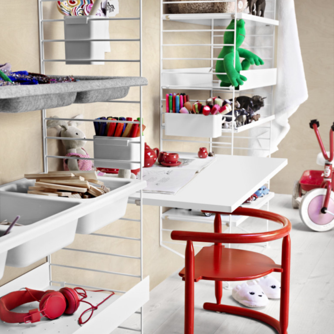With the Swedish String system you will certainly organize the clutter and chaos, but the addition of a height-adjustable desk will also provide the children with a creative or learning space. On this page you will find a wide range of pre-compiled options; everything comes with all the parts needed to make the combinations as pictured.