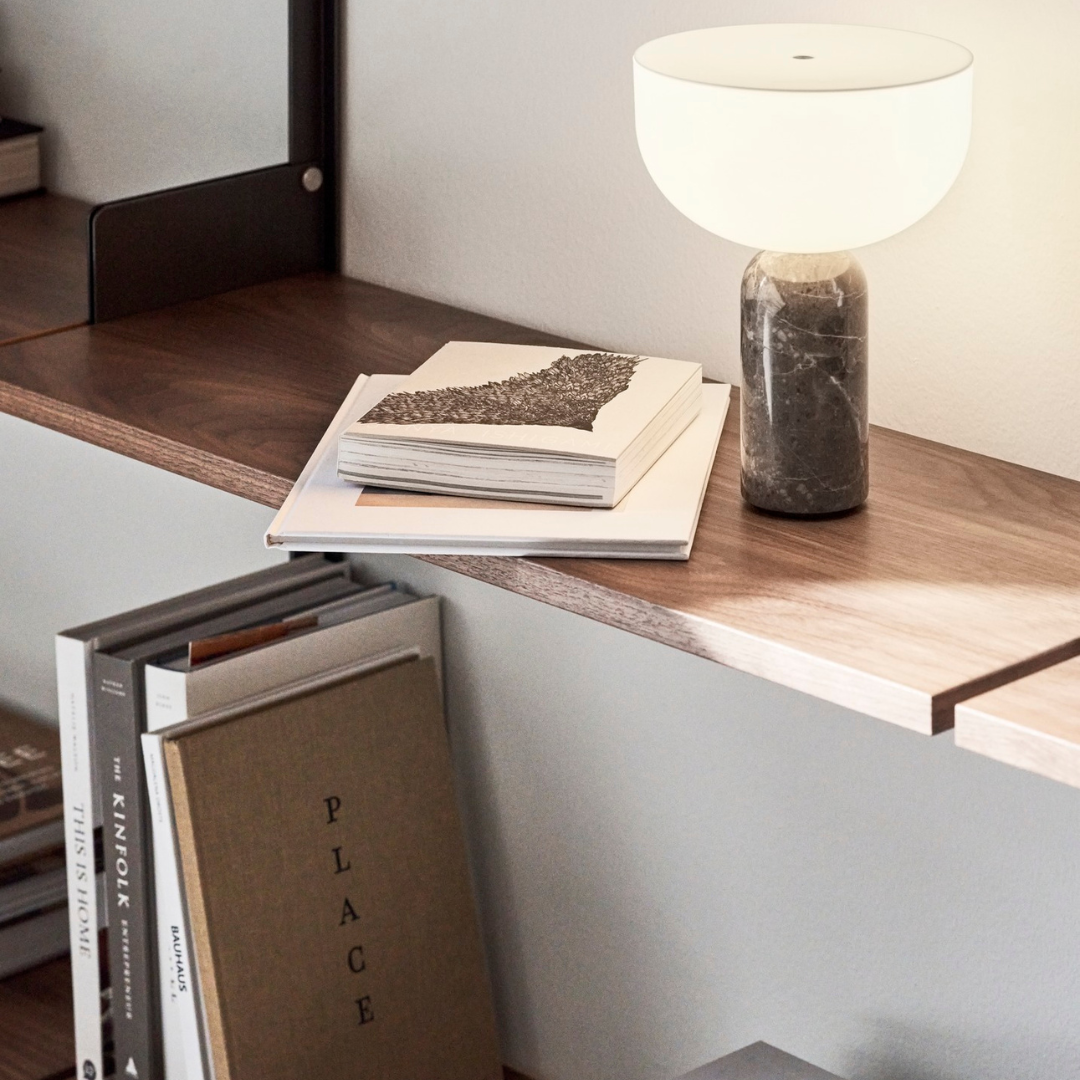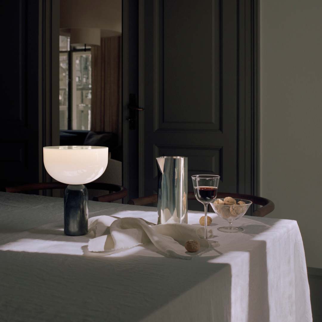 The portable Kizu lamp has a USB-rechargeable battery that provides light for 10 hours at 100% light setting. The cordless table lamp can be dimmed to three levels by tapping the small metal circle on the top.