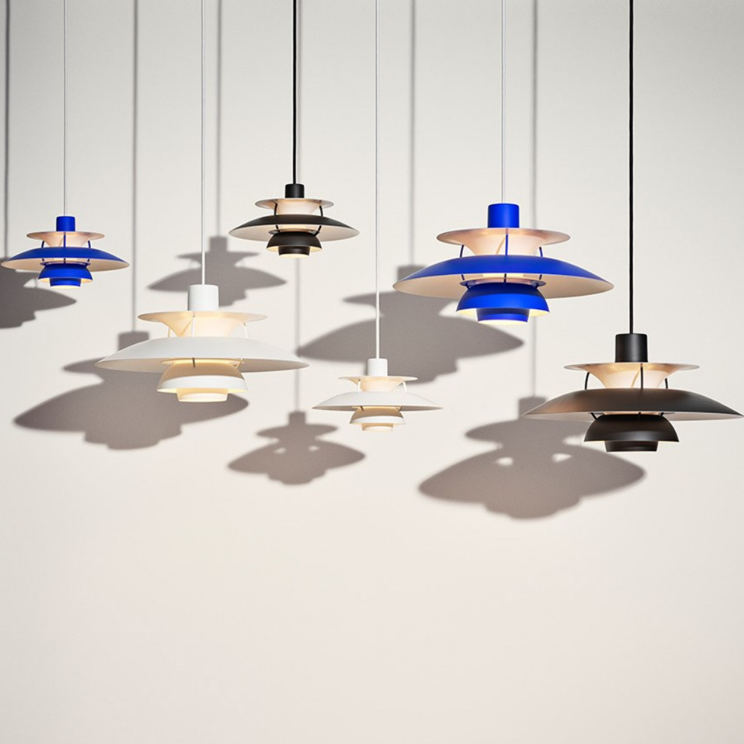 Louis Poulsen PH5 pendant lamp monochrome is available in 3 colors: white, blue and black.