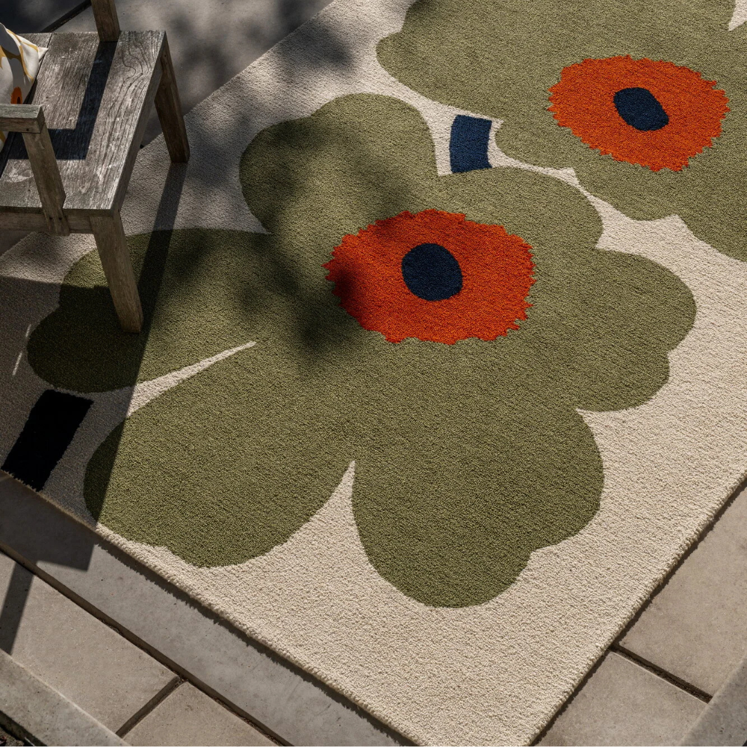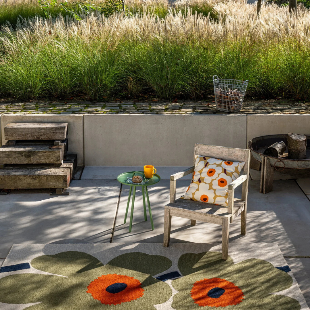This outdoor rug called Unikko is decorated with the iconic Marimekko pattern by Maija Isola. The Unikko pattern was designed in 1964.