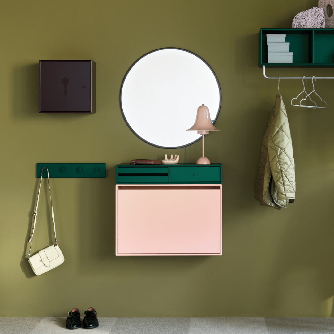 AROUND is a circular mirror that fits perfectly in the bathroom, hallway, or bedroom. The round shape creates a beautiful contrast to the sharper universe of the Montana shelving system.