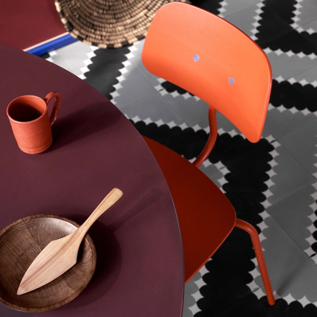 Due to the simplistic design, the sleek steel frame and the smooth wooden surface, the structure of the chair is both sturdy and light. The comfortable seat is perfect for a variety of purposes: as a dining room chair at home, or at the desk, around conference tables and in cafes.