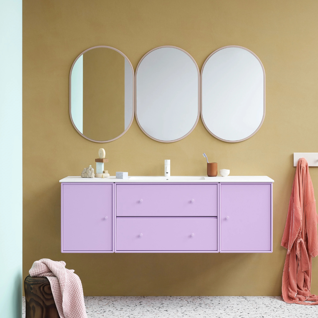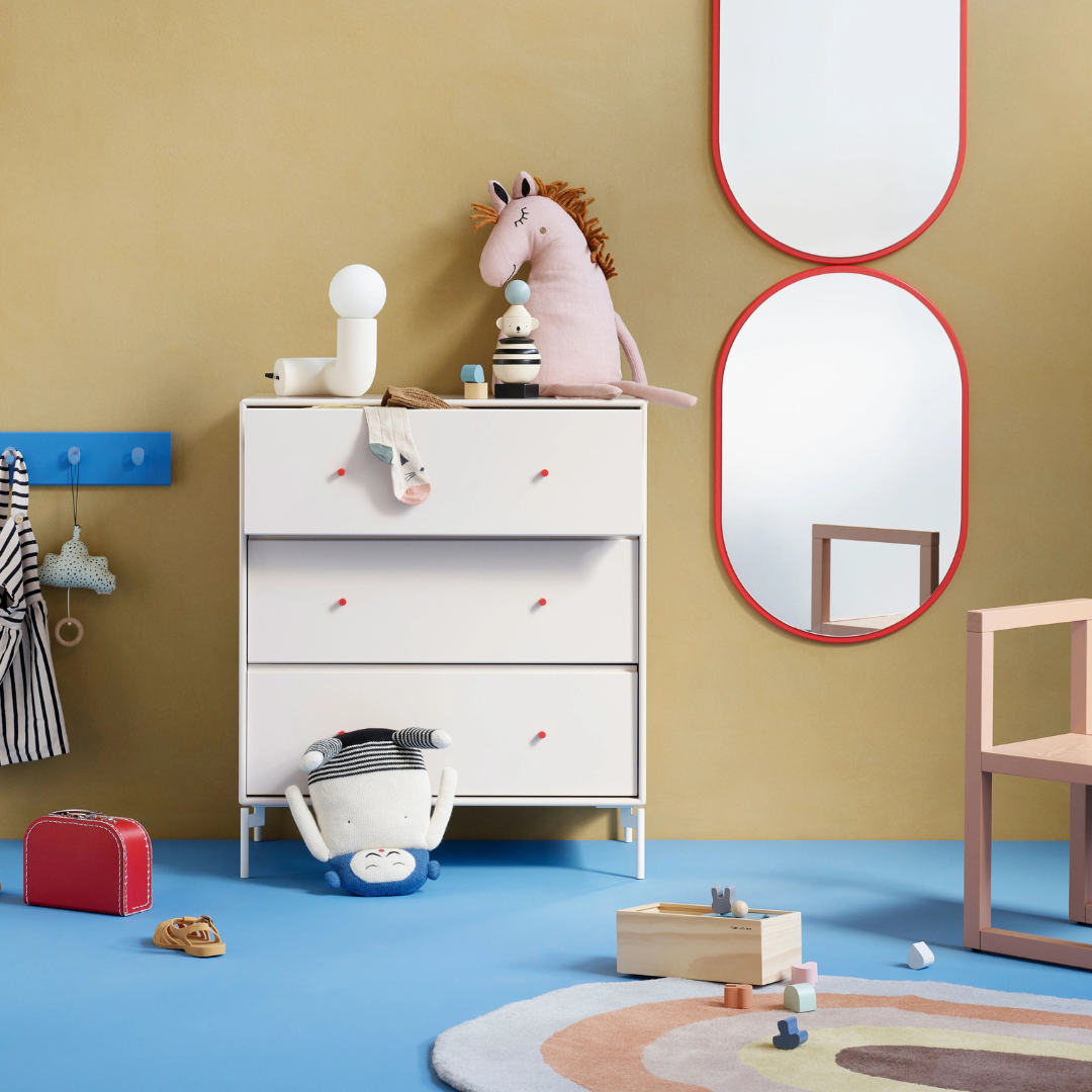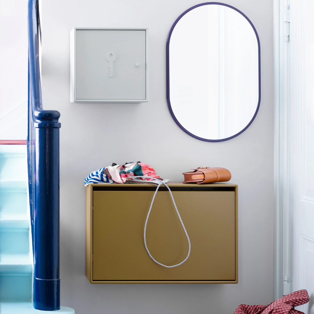 LOOK is a small oval mirror that fits perfectly in the hallway or living room. The oval shape creates a beautiful contrast to the sharper universe of the Montana shelving system.