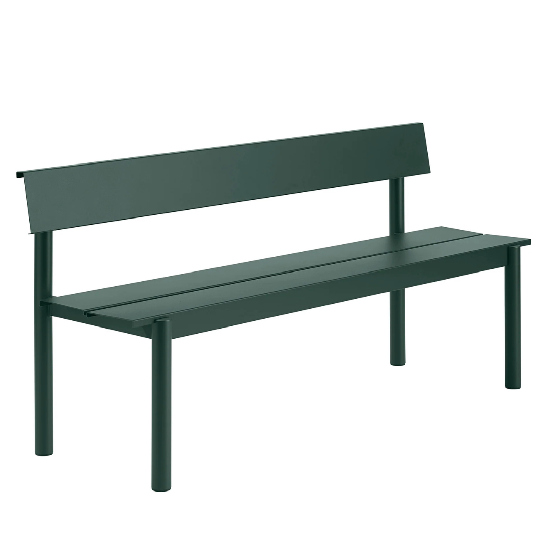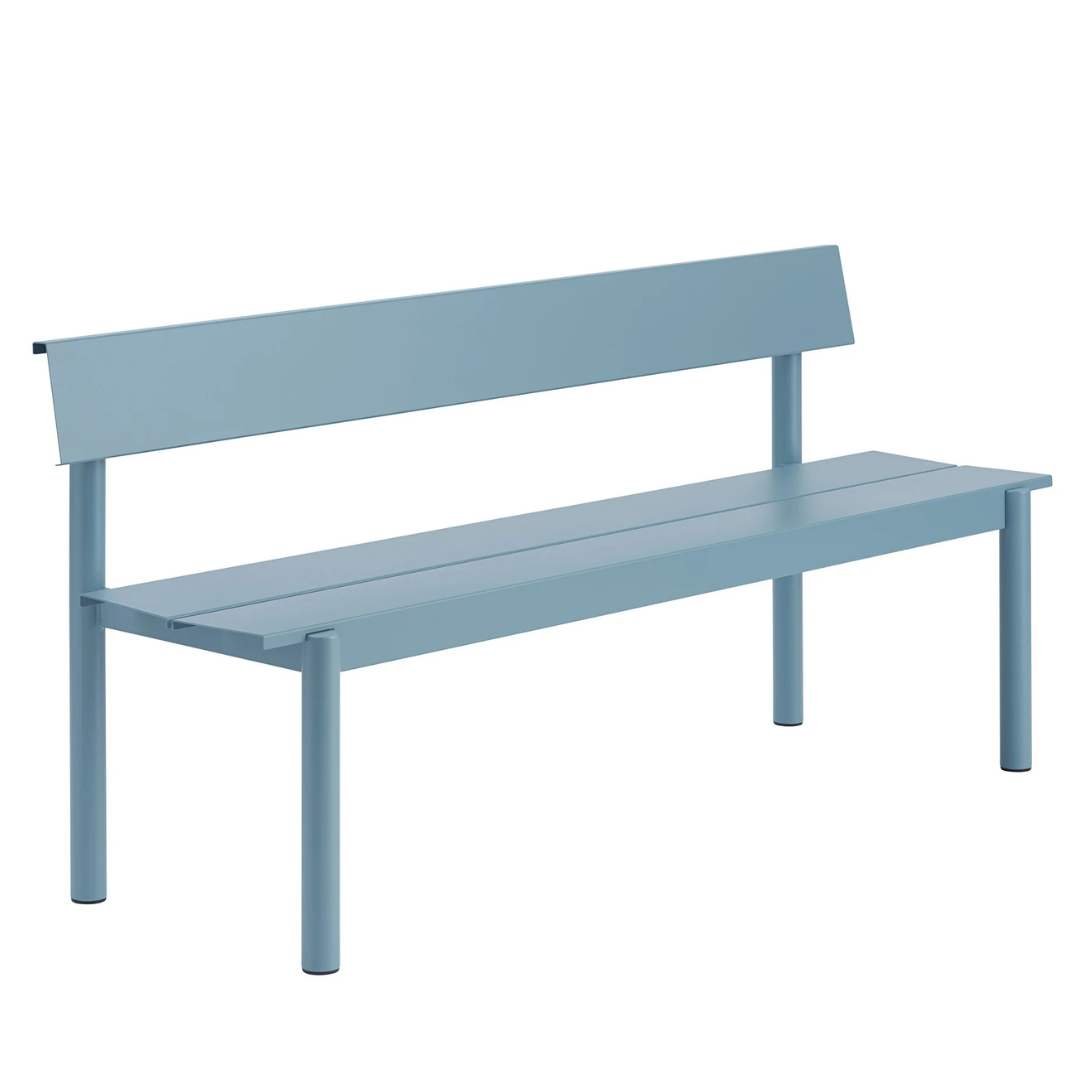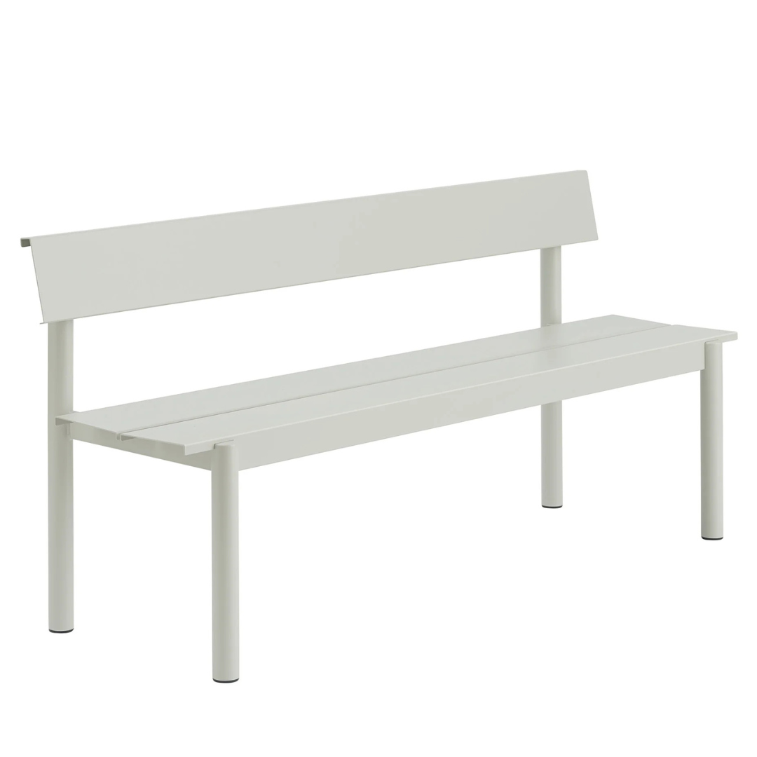 The Linear Steel Bench With Back by Muuto, designed by Thomas Bentzen, offers a contemporary interpretation of modern outdoor furniture. The design features clean lines, subtly folded edges, and a thoughtful open structure that allows water to drain easily—ideal for extended outdoor use.
