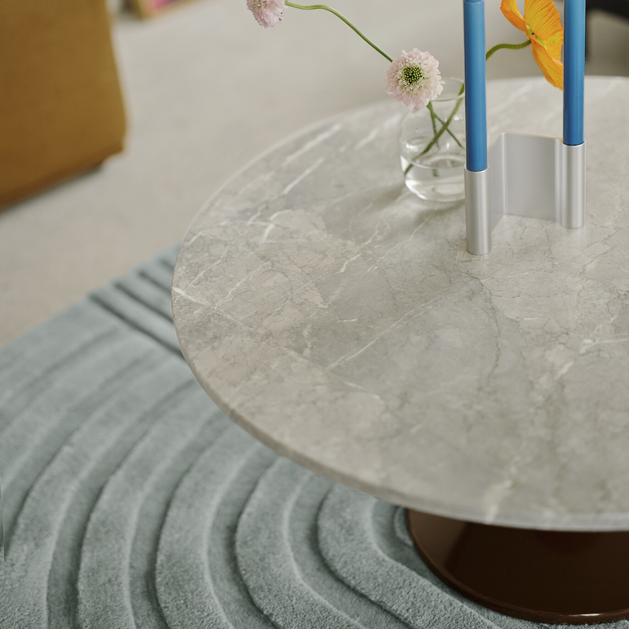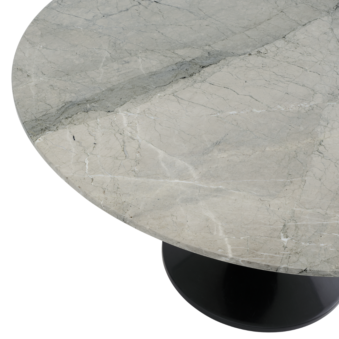 The Midst Coffee Table is a refined blend of sculptural form and luxurious materiality. Its round spun-steel base features a high-gloss finish, creating a striking contrast with the Grey Marble tabletop. The natural stone’s grey tones, intricate veining, and subtle blue undertones are enhanced by a honed matte finish, highlighting its rich details. A timeless design that brings a sense of sophistication to any space.
