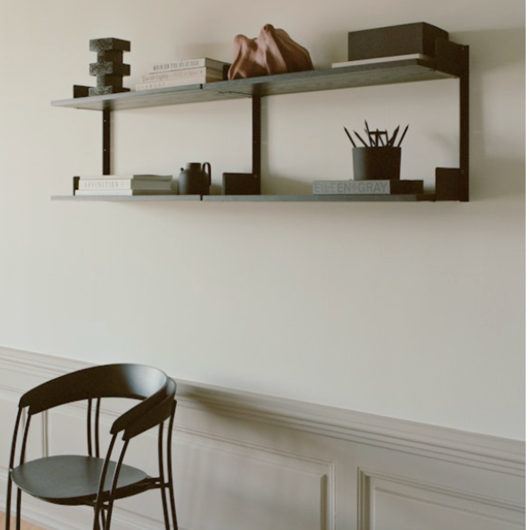 This version of the New Works Chamber Shelf consists of 2 sections with each two shelves and aluminum wall brackets. The shelves feature bookends to keep your favorite items in place - whether you're putting books, crockery or decorative items on a shelf. The name 450 refers to the height of the shelf, which is 45 centimeters.