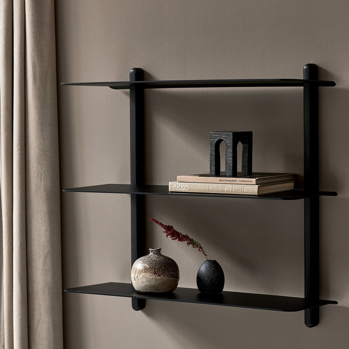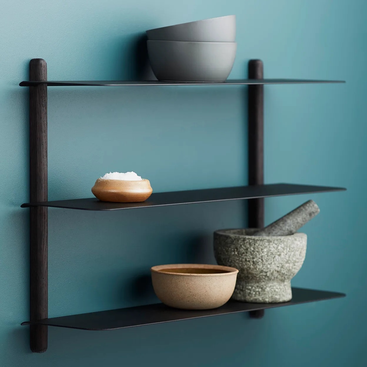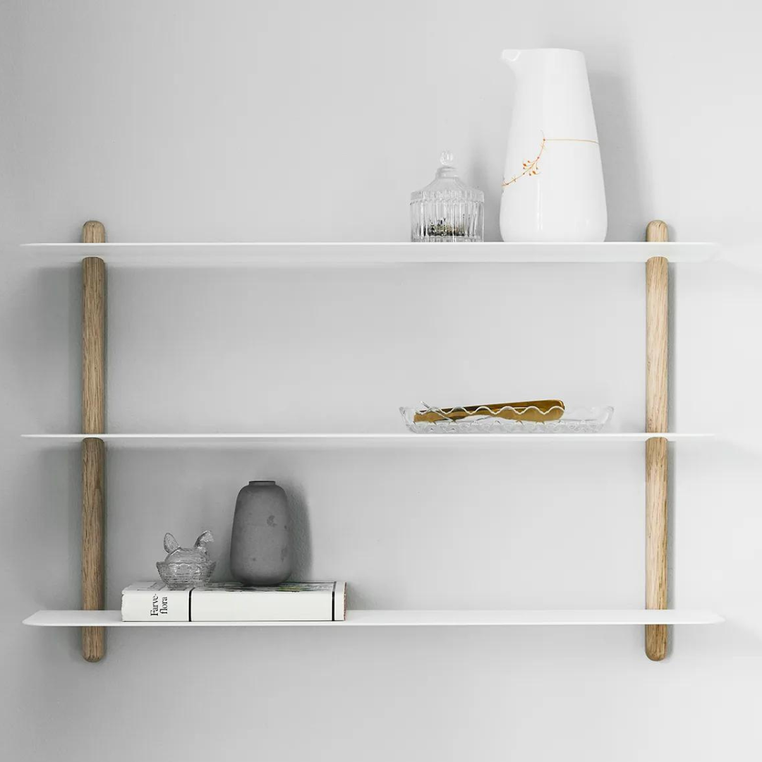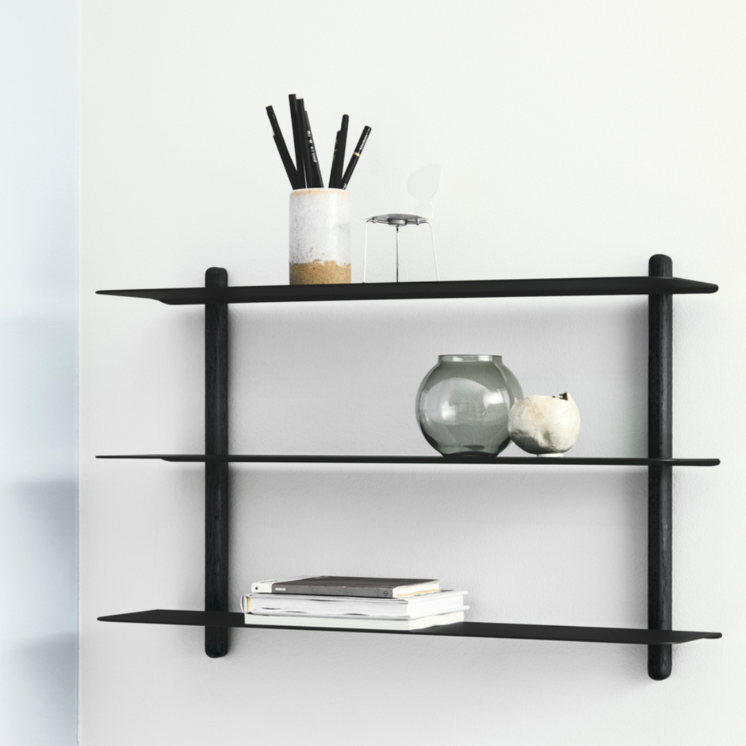The Nivo is available with white or black metal shelves. The white version has natural oak supports and the black version has black ash wood supports.