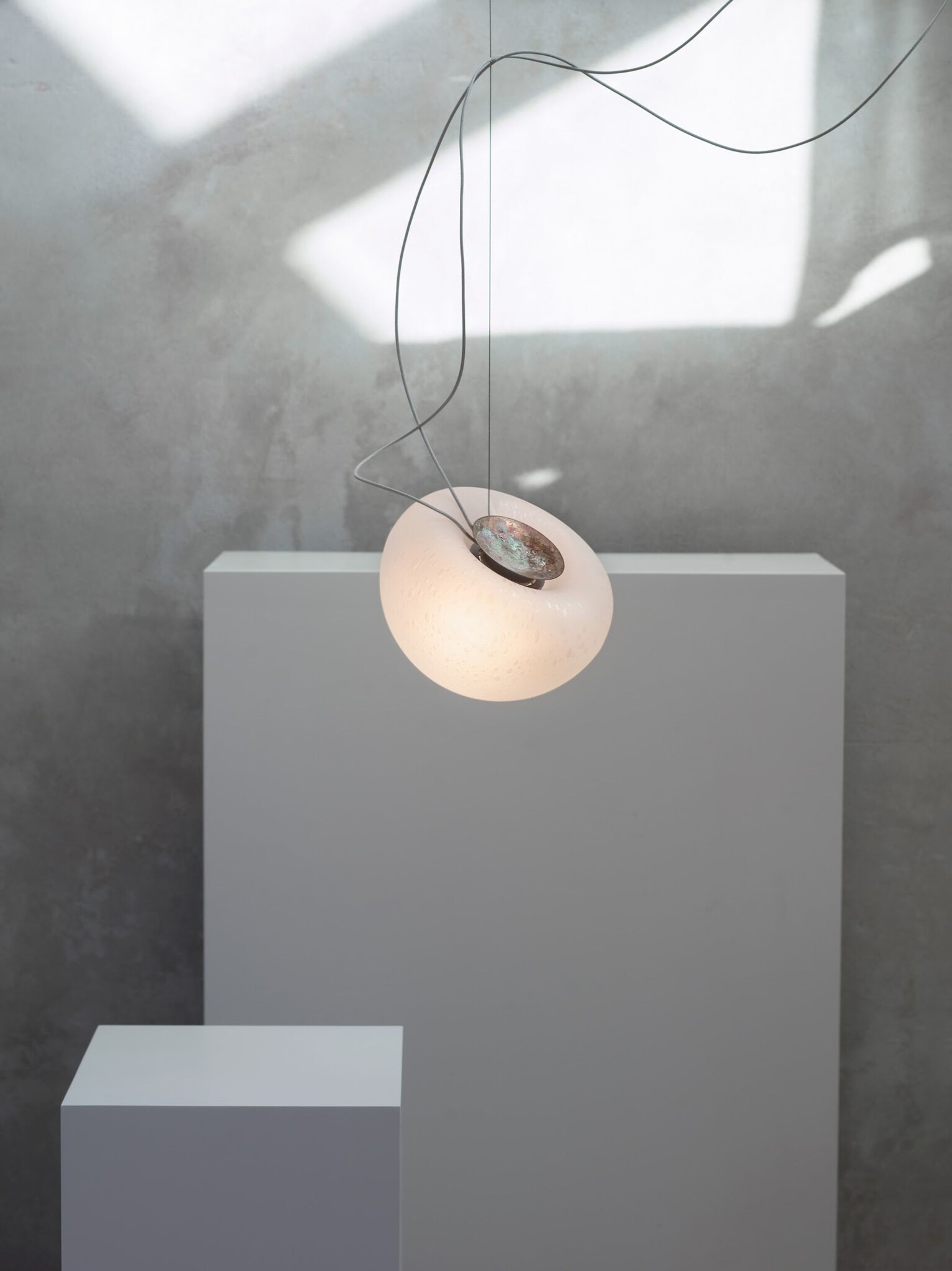 Nautico is a mouth-blown glass pendant with a distinctive bubble-infused texture.