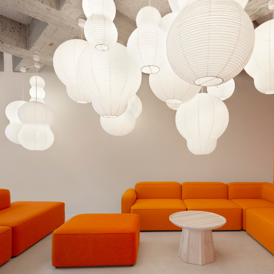 Rice paper provides natural, warm light, as it gently protects the light source from being too bright and overexposed. The lamps give a nice diffused soft light, while they hang in the air like organic sculptures.