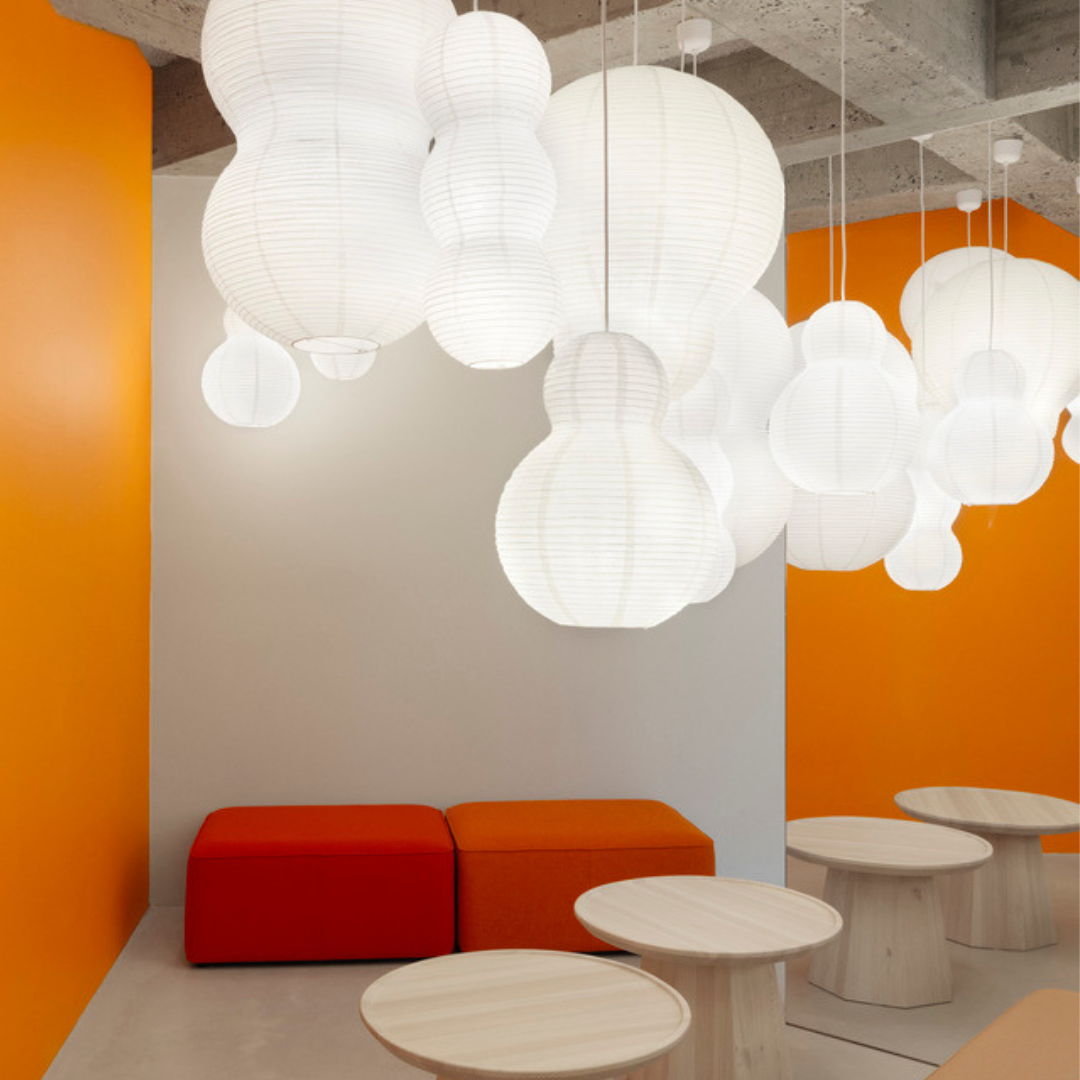 This makes Puff suitable for an above your dining table or a hotel lobby, restaurant. Voluminous yet lightweight through the use of rice paper, creating enormous volume without wasting unnecessary material or creating a heavy, clunky design.