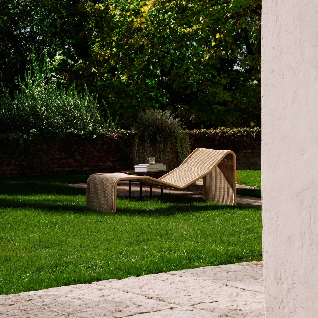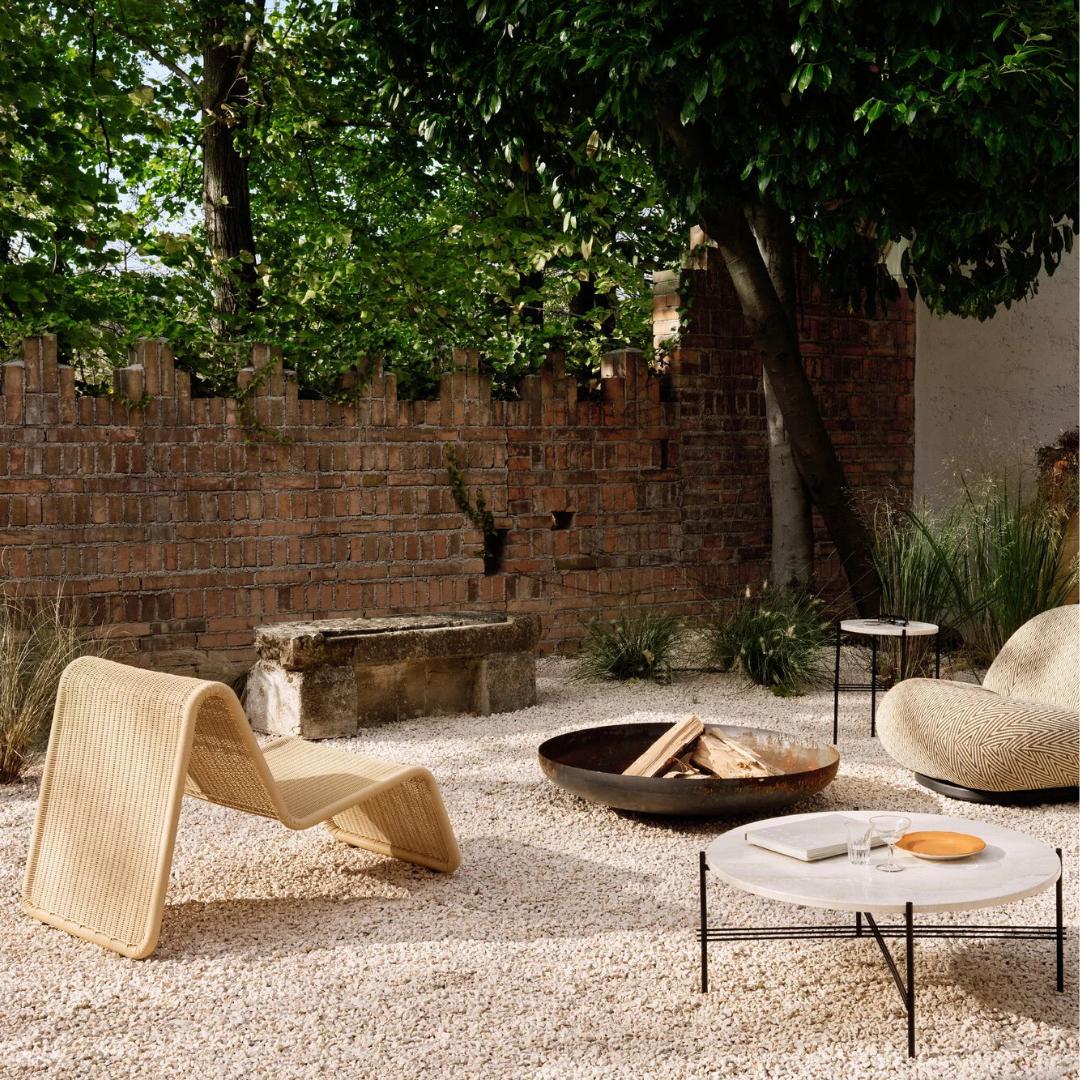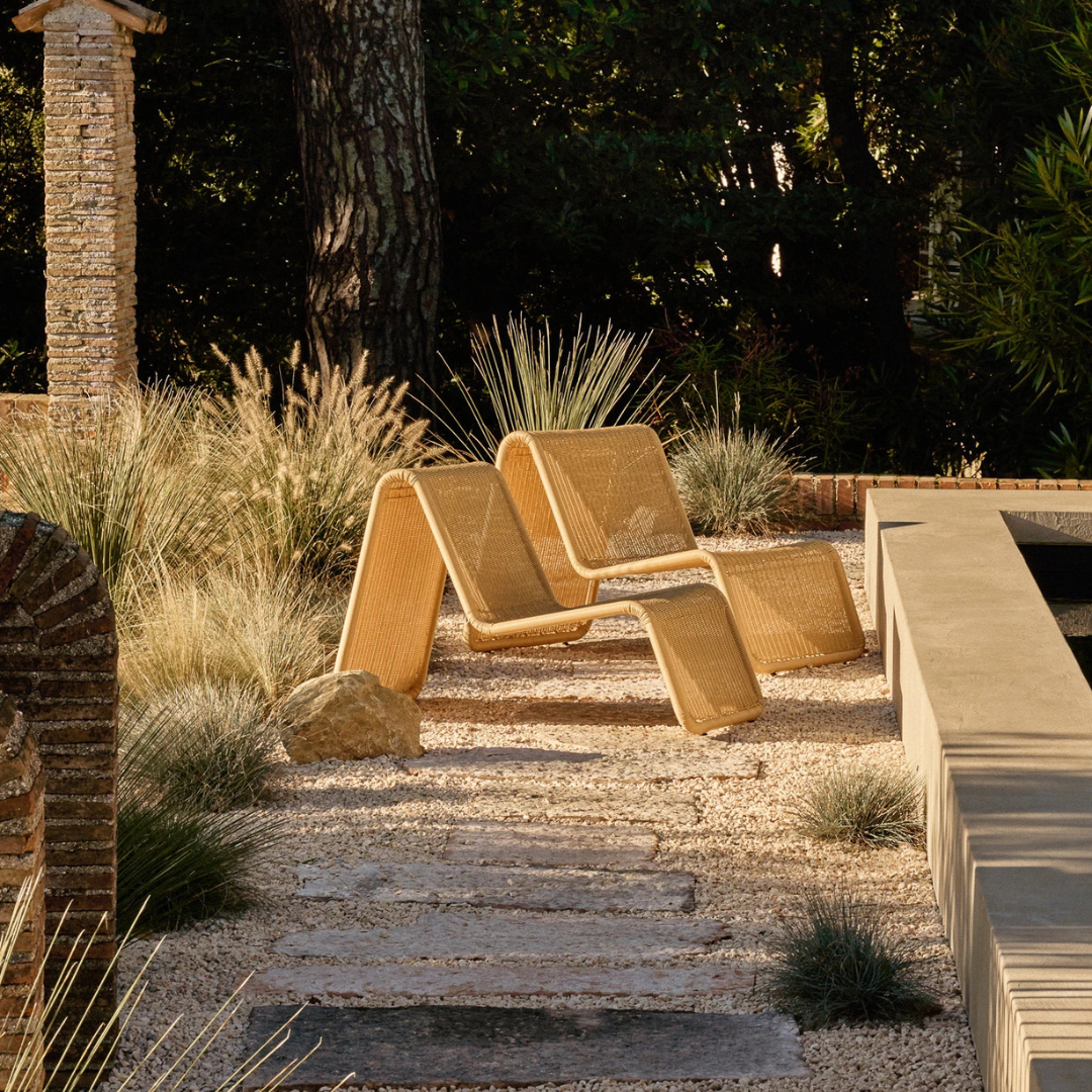 For the outdoor version, the original design has been retained, while the materials have been adapted for long-term outdoor use. The chair is crafted from galvanized steel and finished with a woven HDPE structure that mimics the look of rattan. This creates a light, airy aesthetic with a subtle rhythm, combined with excellent durability and weather resistance.