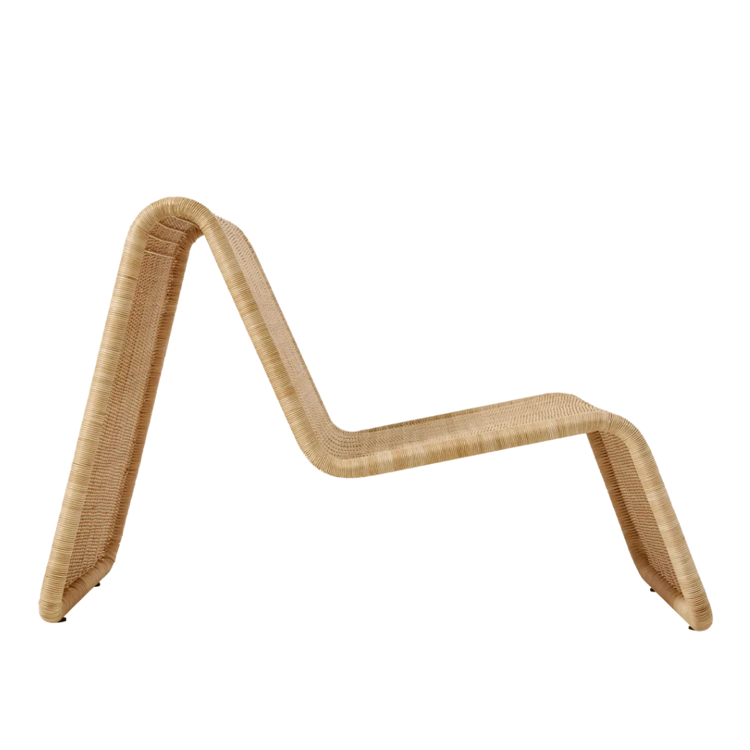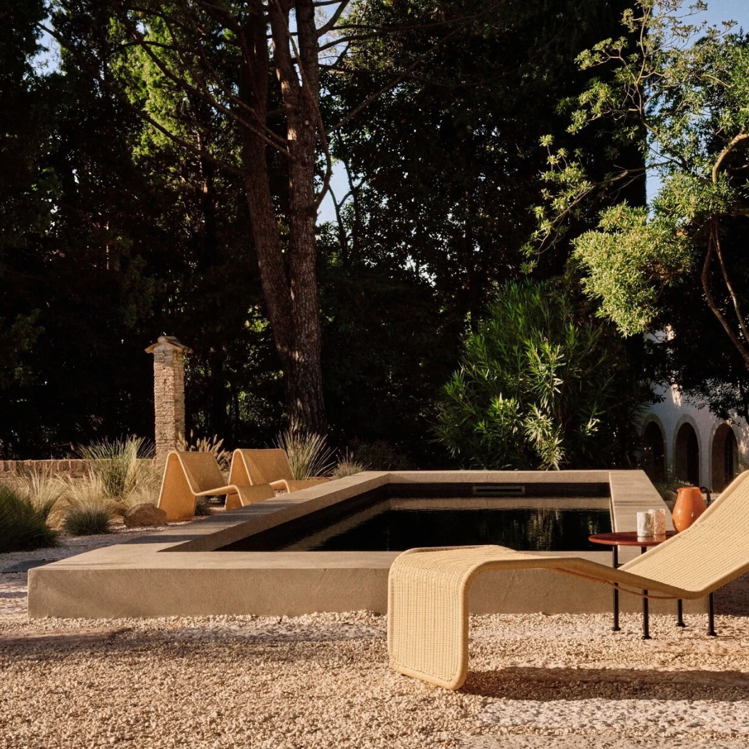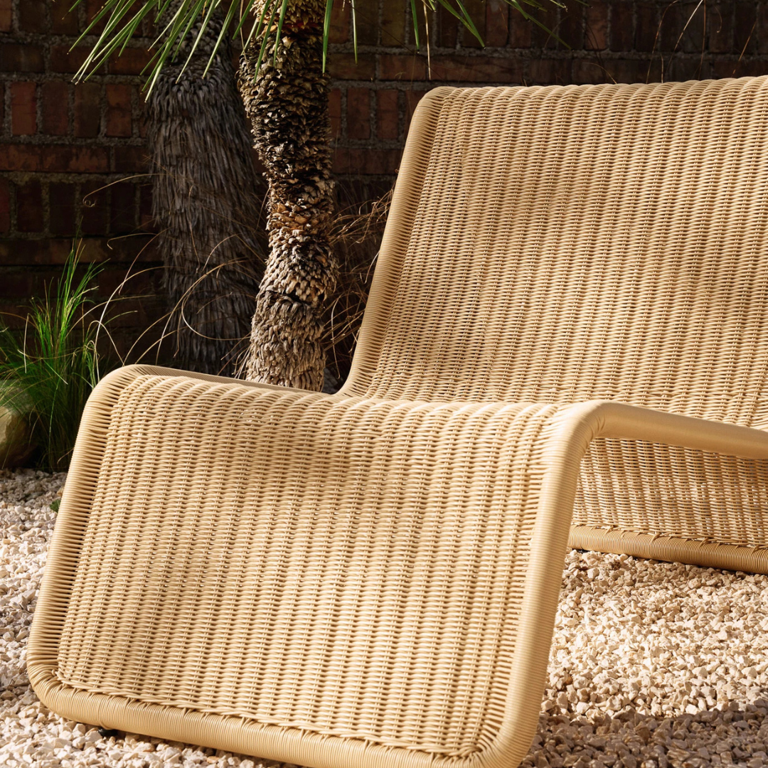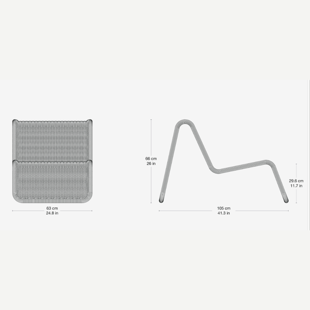 For the outdoor version, the original design has been retained, while the materials have been adapted for long-term outdoor use. The chair is crafted from galvanized steel and finished with a woven HDPE structure that mimics the look of rattan. This creates a light, airy aesthetic with a subtle rhythm, combined with excellent durability and weather resistance.