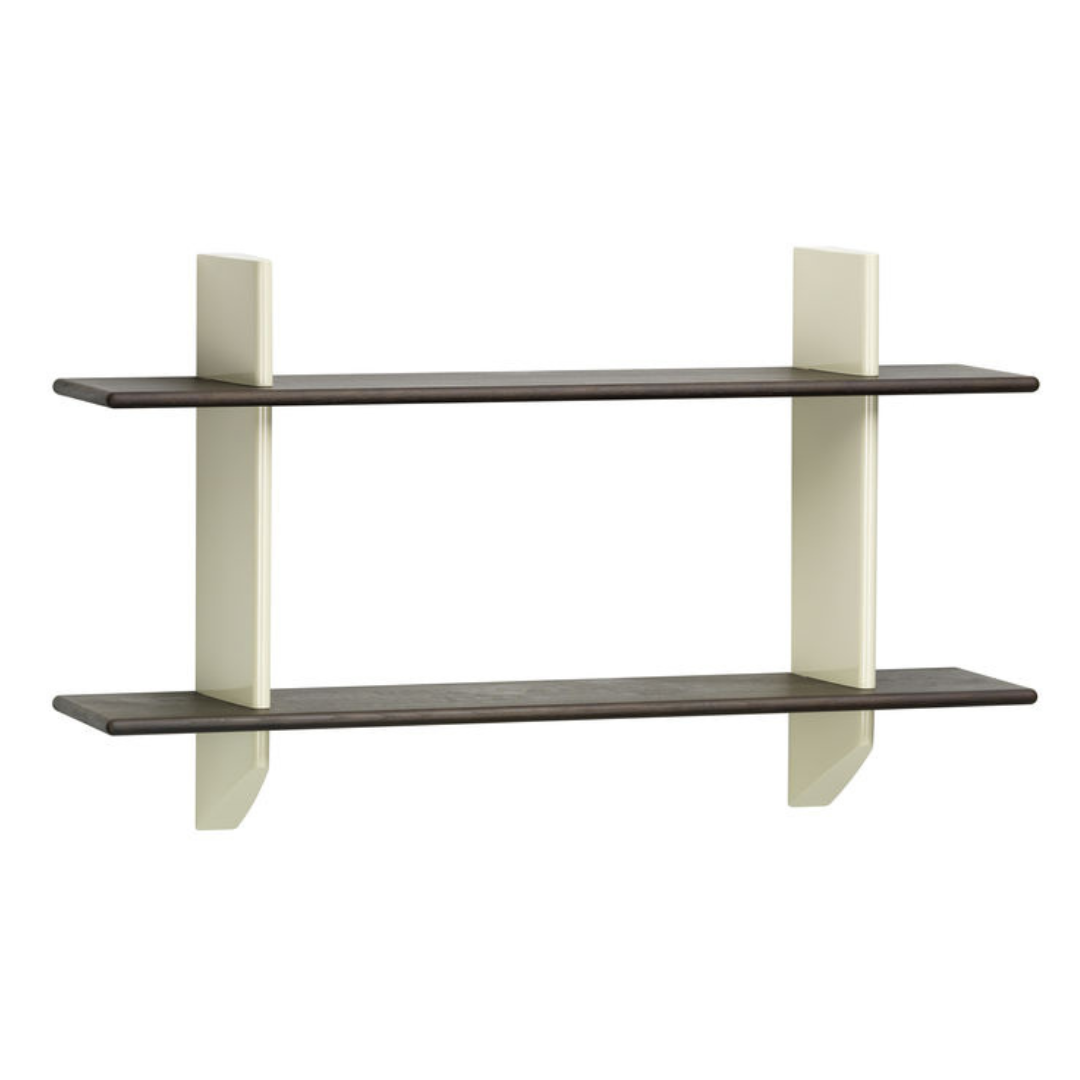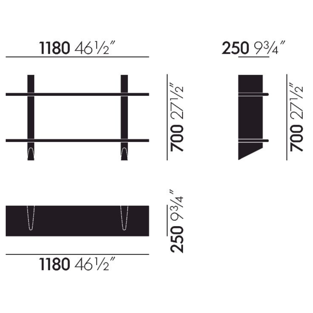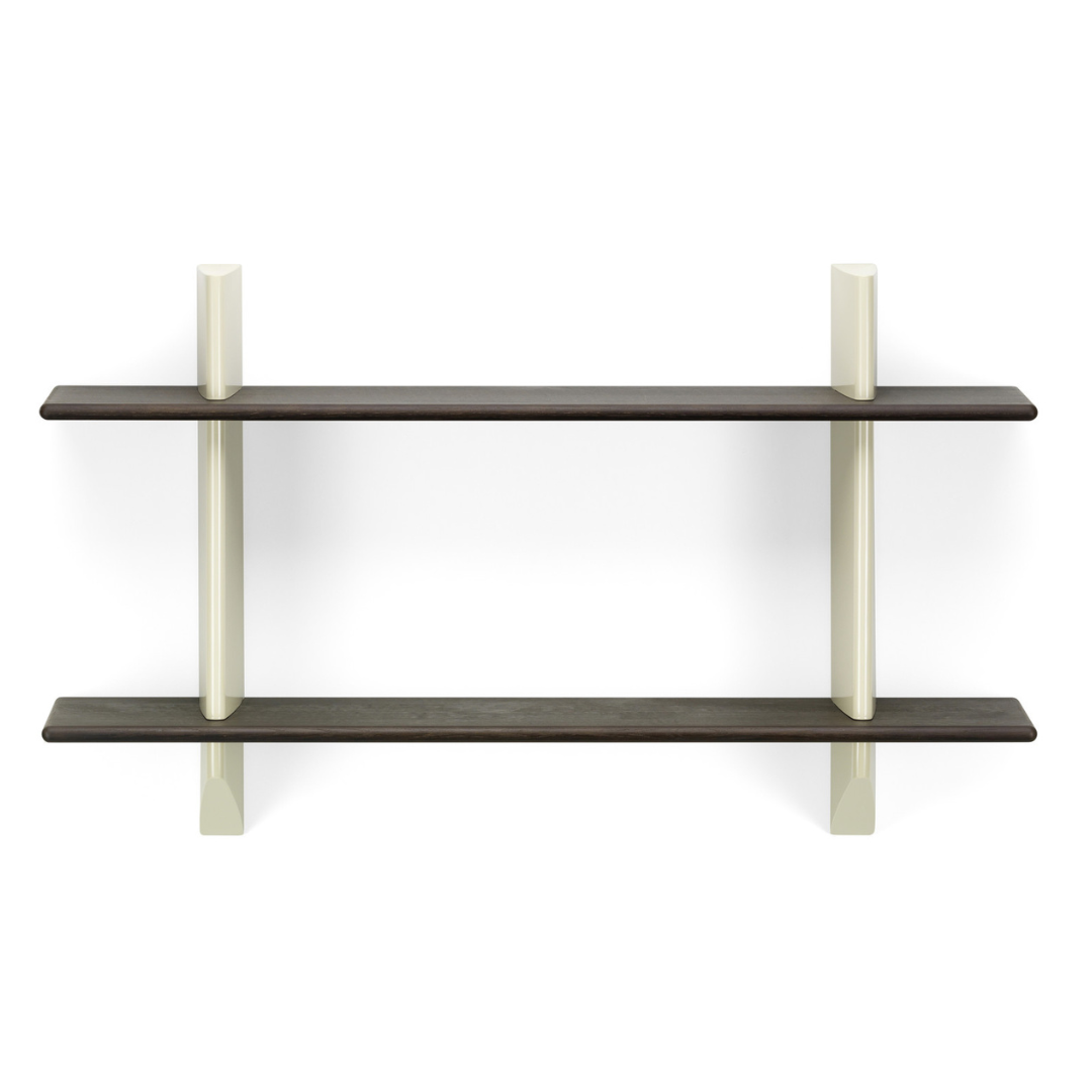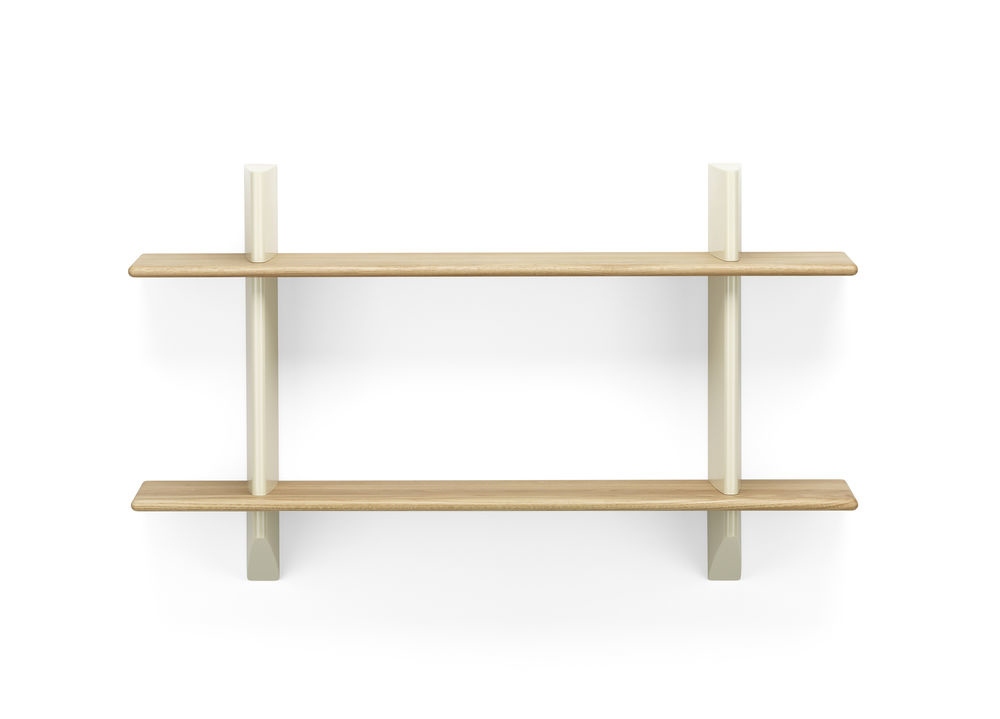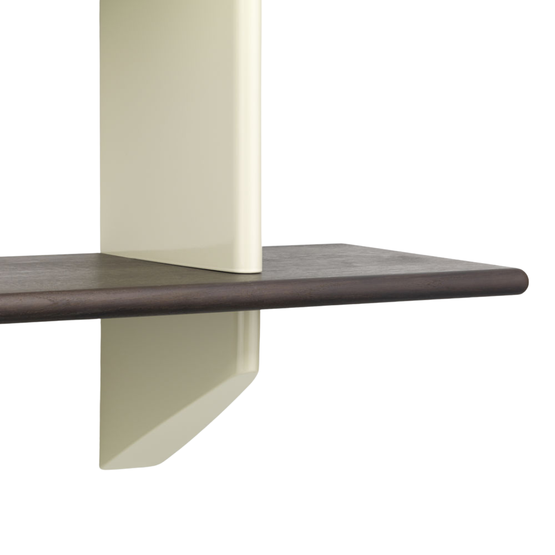 The wall brackets have precise horizontal slots in which the solid wooden planks can be placed. Together, the two contrasting materials form a practical shelf with the sculptural qualities of an aesthetic object. The wooden shelves are available in light or dark oak, while the wall brackets are available in various original Prouvé colours.
