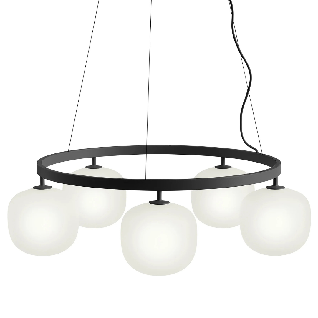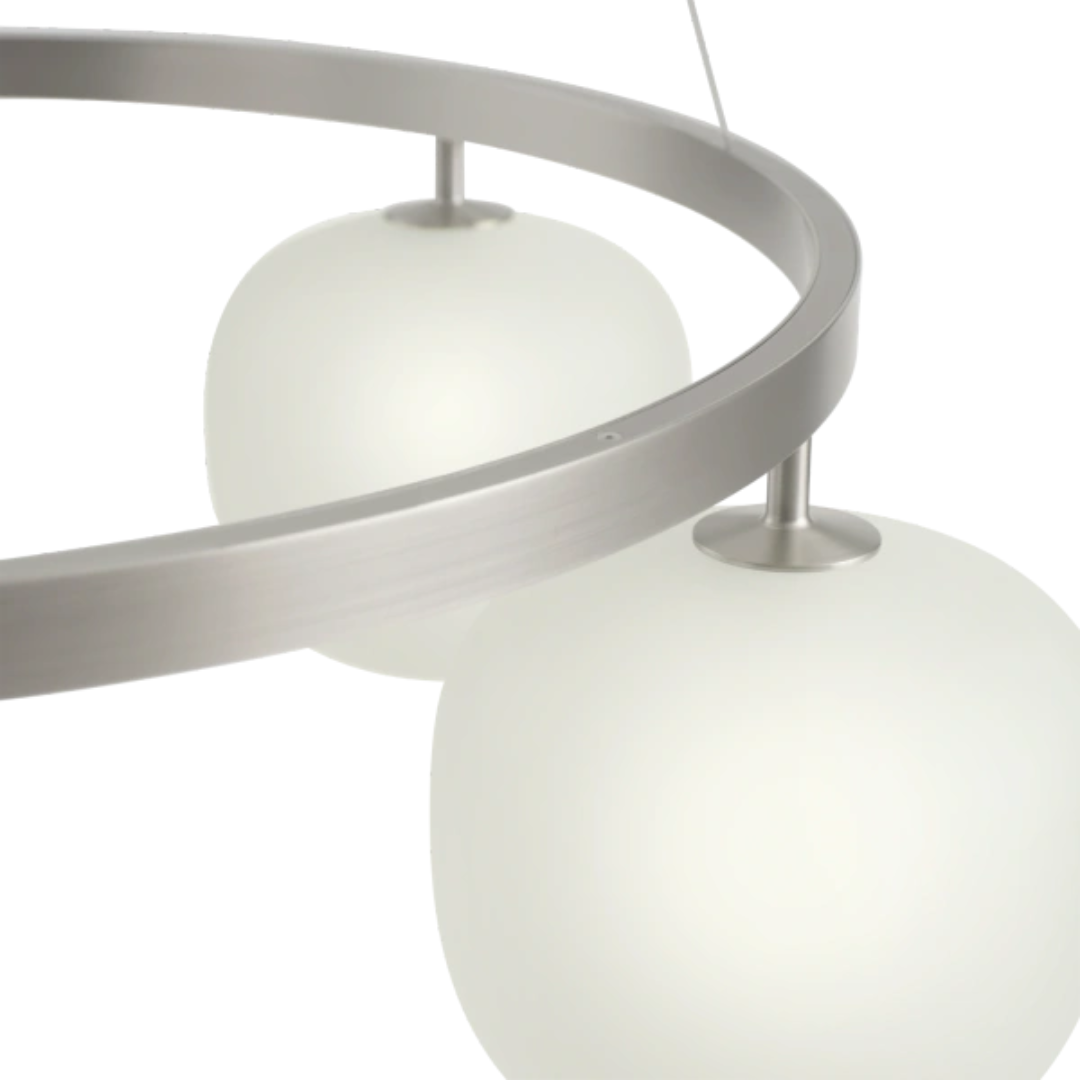 Five mouth-blown, sandblasted glass spheres cast a diffused, pleasant light that envelops the space with tranquility and balance. The matte glass finish softens the light source, while the square aluminum support structure creates a powerful, modern contrast. This interplay of soft and sleek makes the Rime Chandelier a subtle statement piece.
