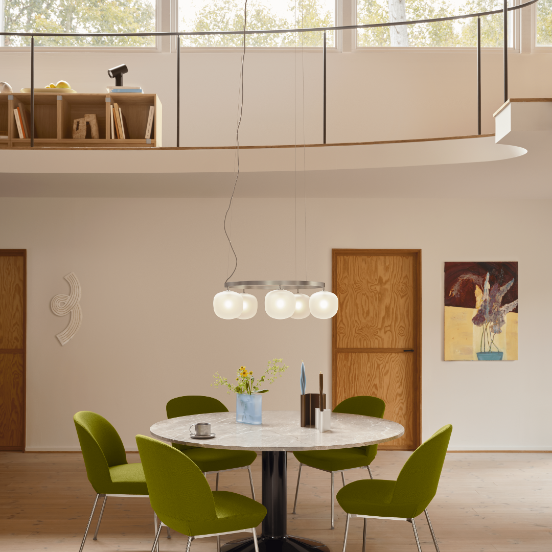 Thanks to its horizontal composition and generous dimensions, the Rime Chandelier is ideally suited for spaces with high ceilings. Above a round dining table, in an open-plan living area, or in a hospitality setting, its sculptural character truly comes into its own. The design exudes an understated luxury that seamlessly complements both modern and Scandinavian interiors.