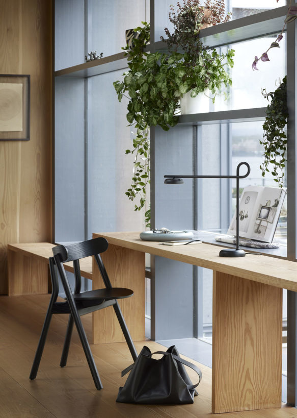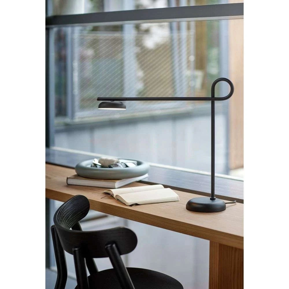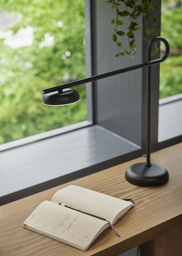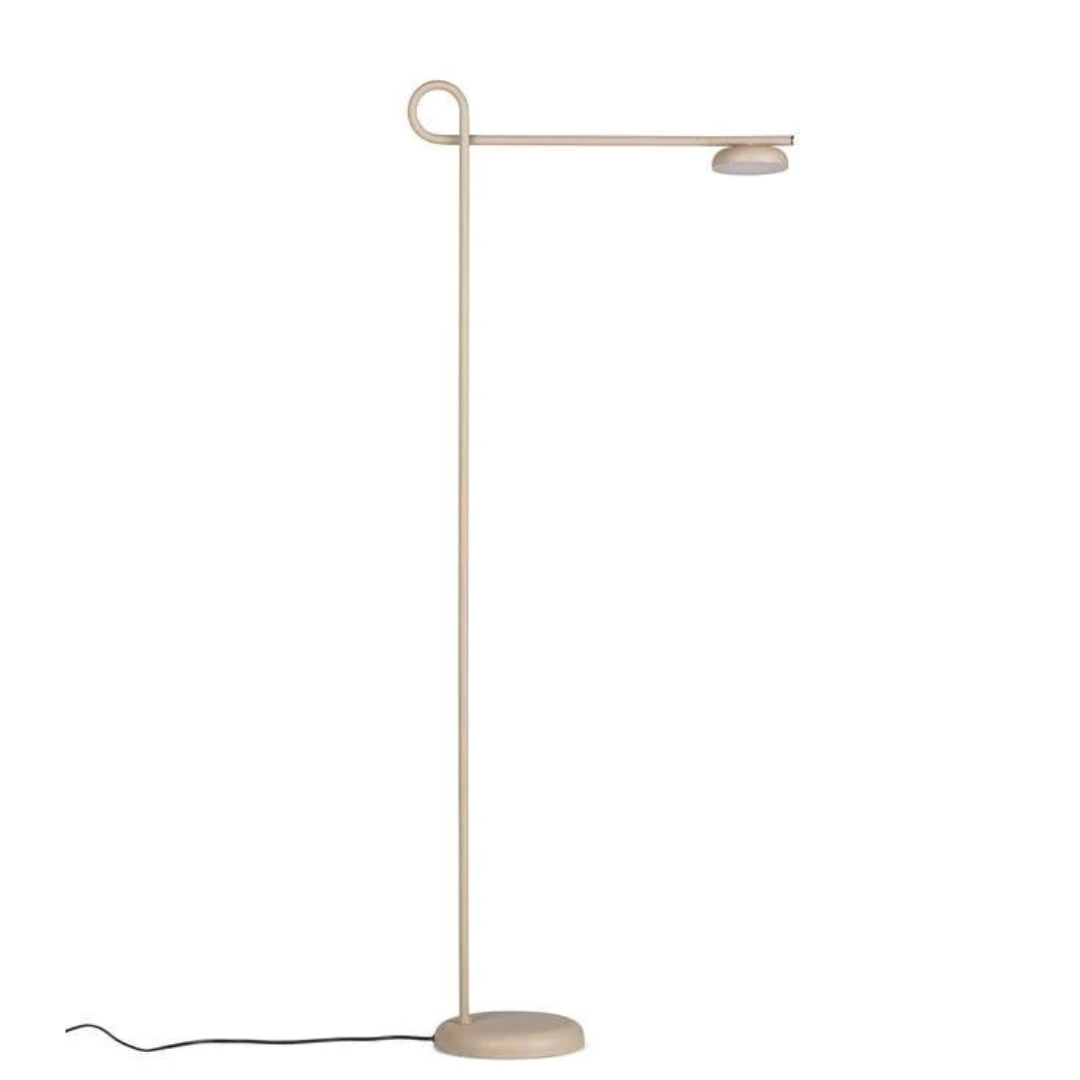 The Salo lamp visually runs from the vertical base to its horizontal arm in one smooth and seamless movement. The Salto is available as a floor lamp and table lamp and comes in a matte black or beige finish.