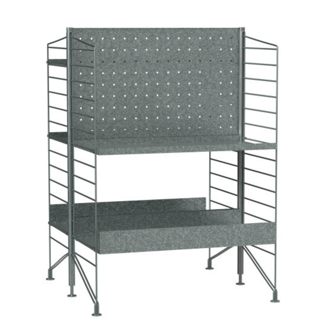 Free standing galvanized shelf intended for outdoor use. This smaller one section combination is optimal for the smaller outdoor space, such as a balcony. With one galvanized metal shelf with high edge and one with low edge this combination gives you plenty of storage for larger items.