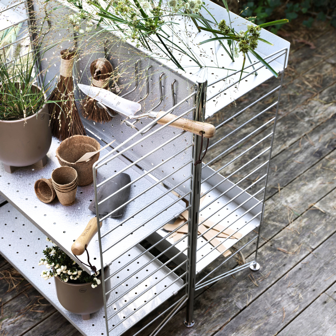 This larger three section combination is optimal for the larger balcony or patio. With galvanized panels and planks, the surface changes with time and gives a beautiful patina. A combination of shelves with high and low edges gives the cabinet character.